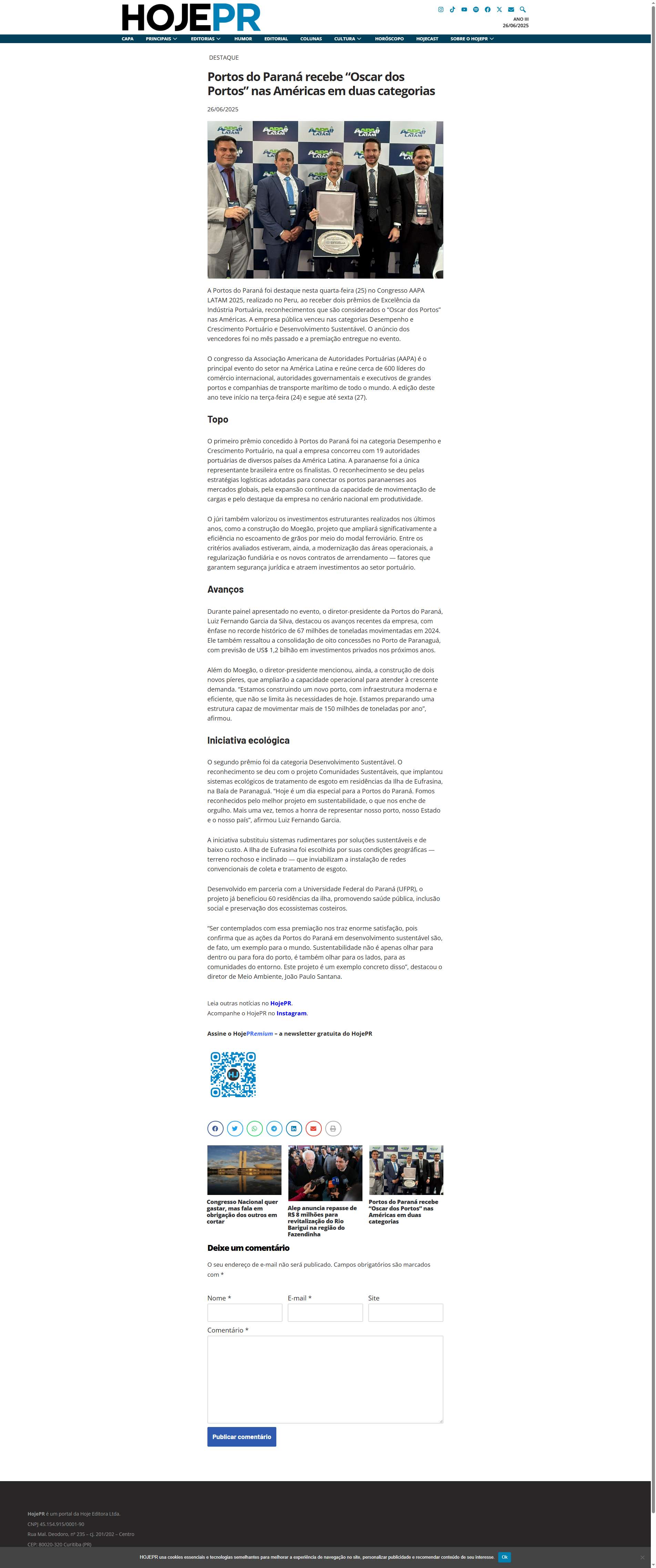 Portos do Paraná. Fomos reconhecidos pelo melhor projeto em sustentabilidade, o que nos enche de orgulho. Mais uma vez, temos a honra de representar nosso porto, nosso Estado e o nosso país”, afirmou