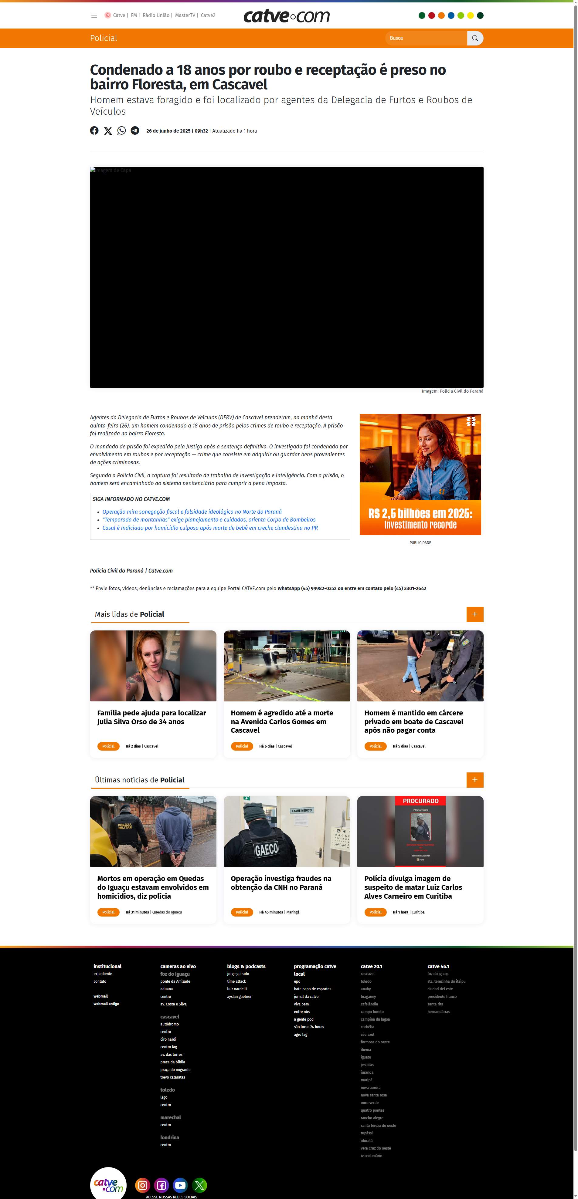 Agentes da Delegacia de Furtos e Roubos de Veículos (DFRV) de Cascavel prenderam, na manhã desta quinta-feira (26), um homem condenado a 18 anos de prisão pelos crimes de roubo e receptação. A prisão foi realizada no bairro Floresta.