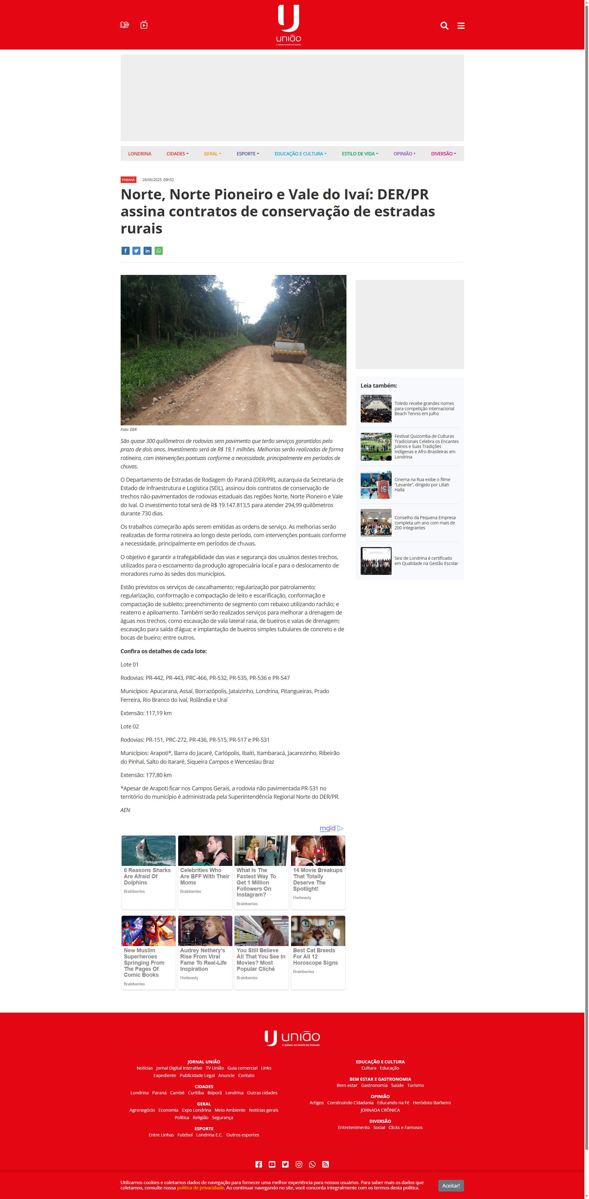 rodovias estaduais das regiões Norte, Norte Pioneiro e Vale do Ivaí. O investimento total será de R$ 19.147.813,5 para atender 294,99 quilômetros durante 730 dias.