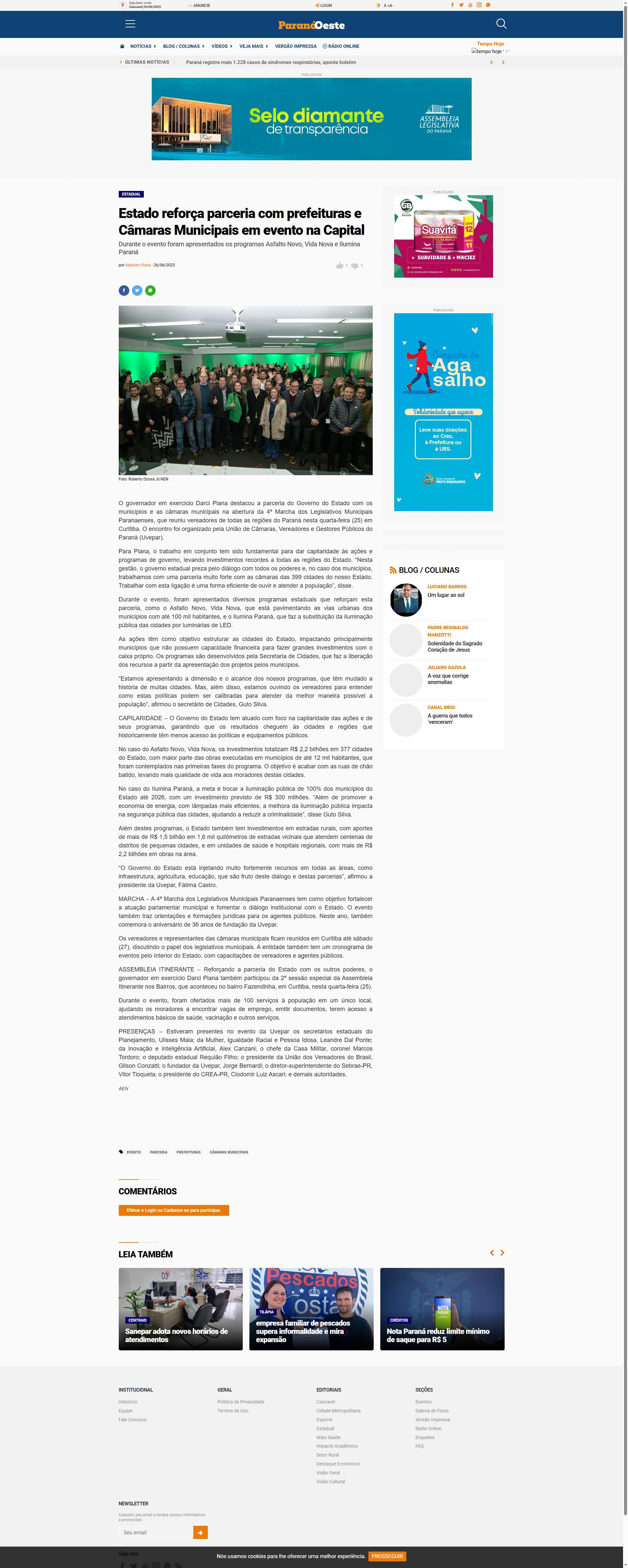 Paraná, a meta é trocar a iluminação pública de 100% dos municípios do Estado até 2026, com um investimento previsto de R$ 300 milhões. “Além de promover a economia de energia, com lâmpadas mais eficientes, a melhora da iluminação pública impacta na segurança pública das cidades, ajudando a reduzir a criminalidade”, disse