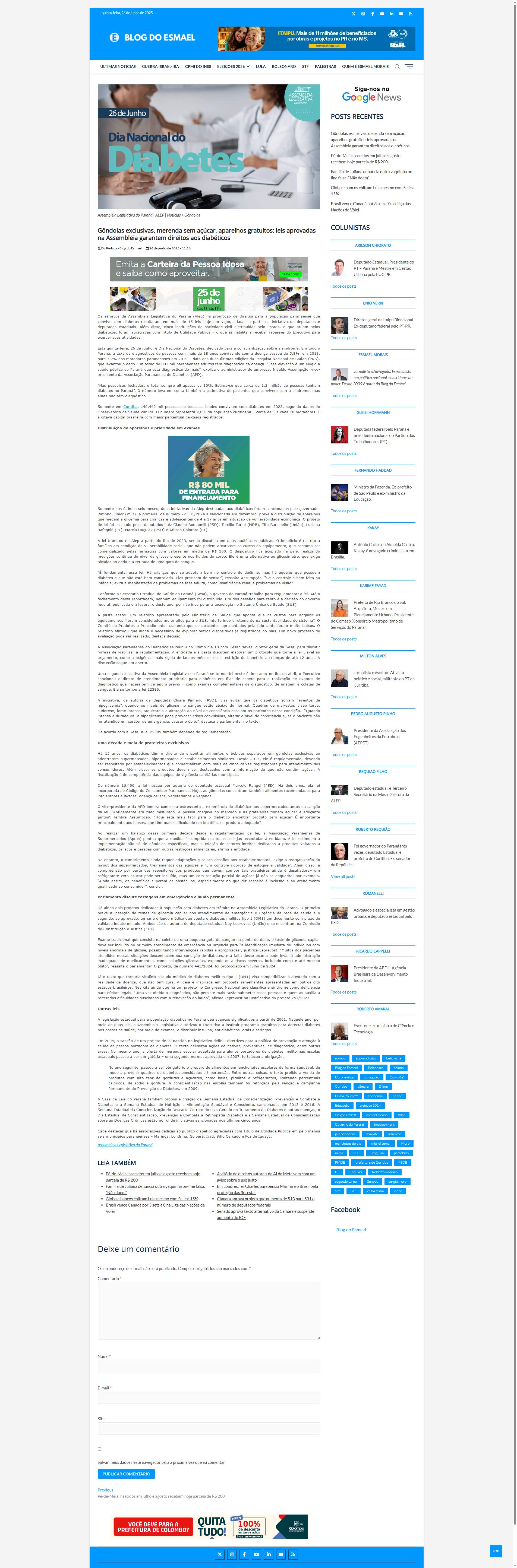 Paraná. O primeiro prevê a inserção de testes de glicemia capilar nos atendimentos de emergência e urgência da rede de saúde e o segundo, se aprovado, tornaria o laudo médico que atesta o diabetes mellitus tipo 1 (DM1) um documento com prazo de validade indeterminado. Ambos são de autoria do deputado estadual Ney Leprevost (União) e se encontram na Comissão de Constituição e Justiça (CCJ).