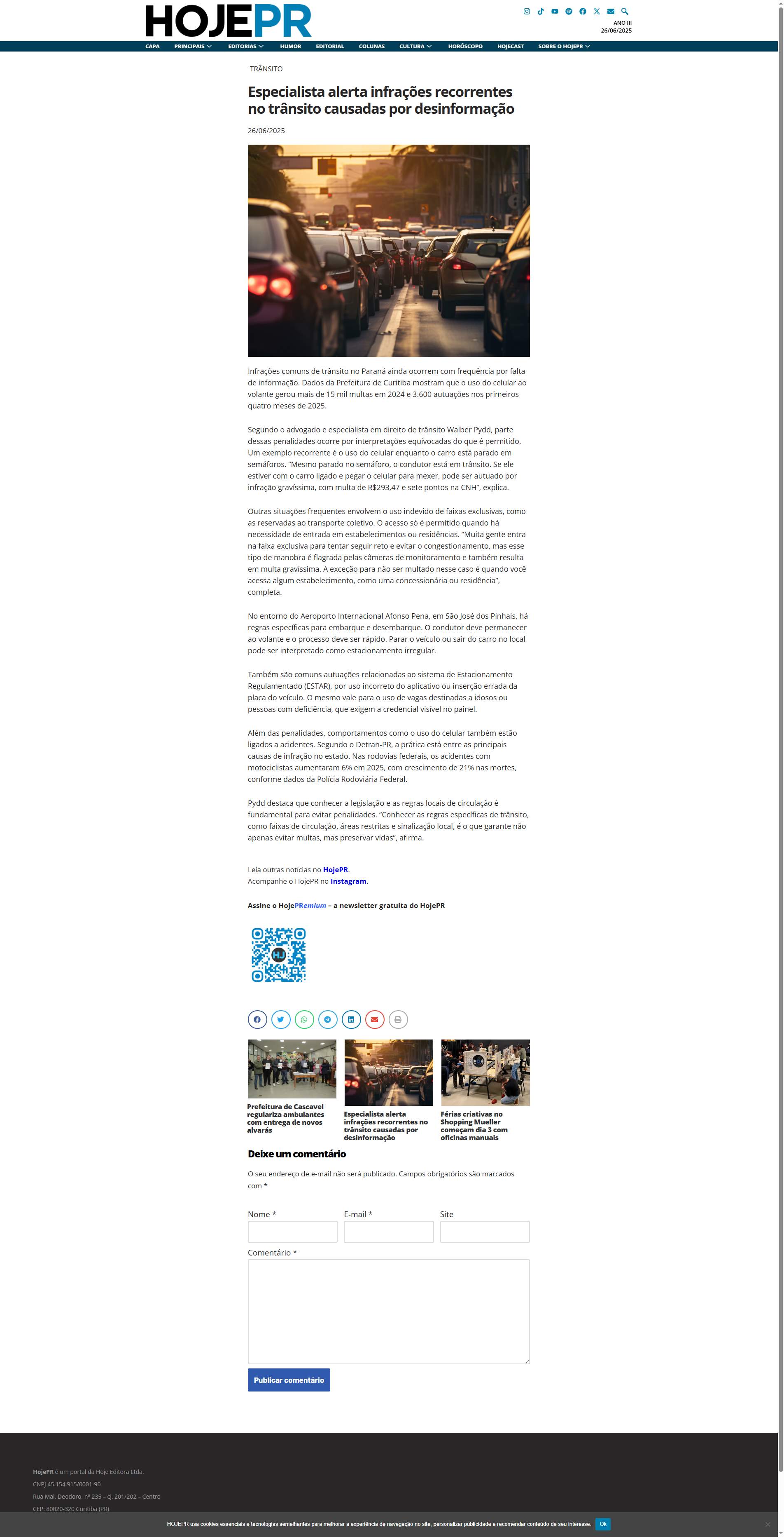 Infrações comuns de trânsito no Paraná ainda ocorrem com frequência por falta de informação. Dados da Prefeitura de Curitiba mostram que o uso do celular ao volante gerou mais de 15 mil multas em 2024 e 3.600 autuações nos primeiros quatro meses de 2025.