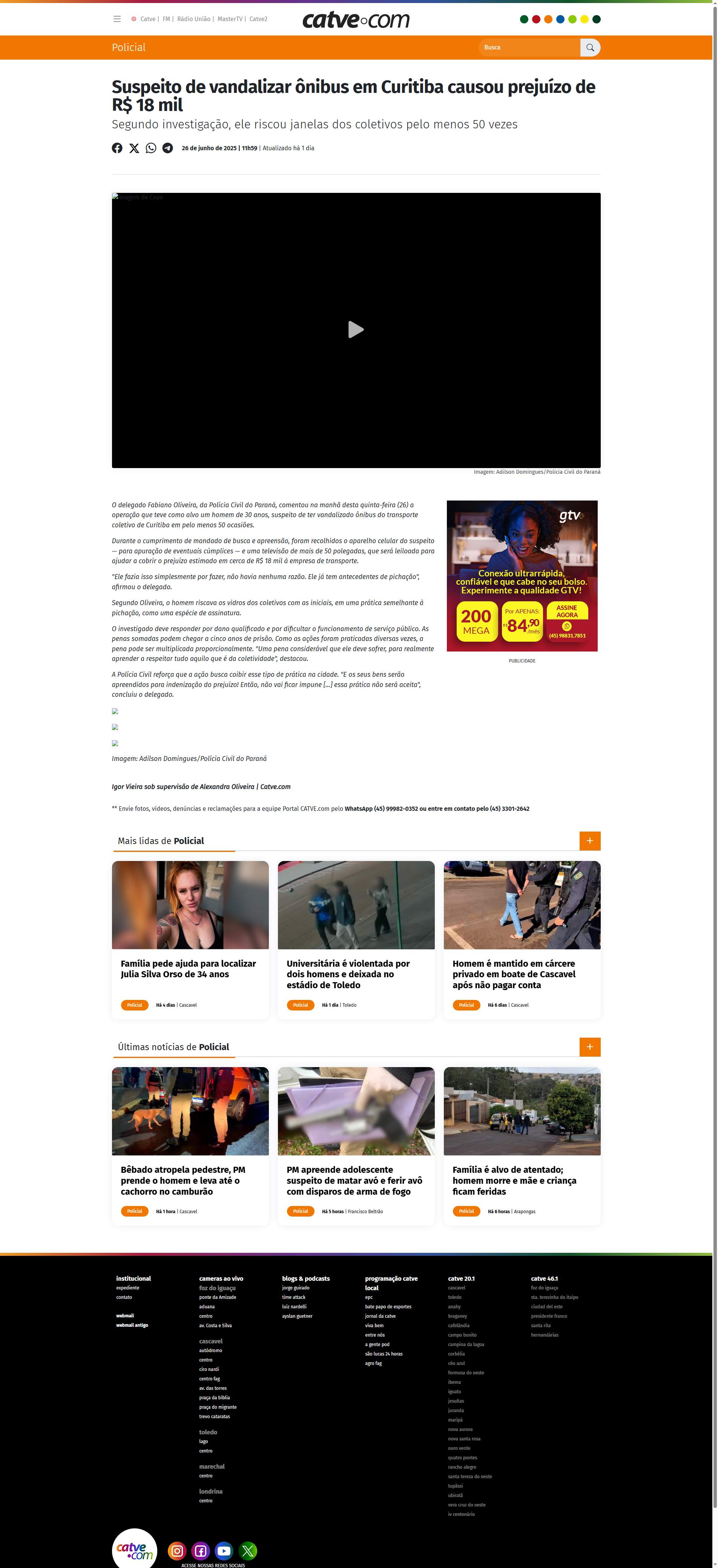 Polícia Civil do Paraná, comentou na manhã desta quinta-feira (26) a operação que teve como alvo um homem de 30 anos, suspeito de ter vandalizado ônibus do transporte coletivo de Curitiba em pelo menos 50 ocasiões.