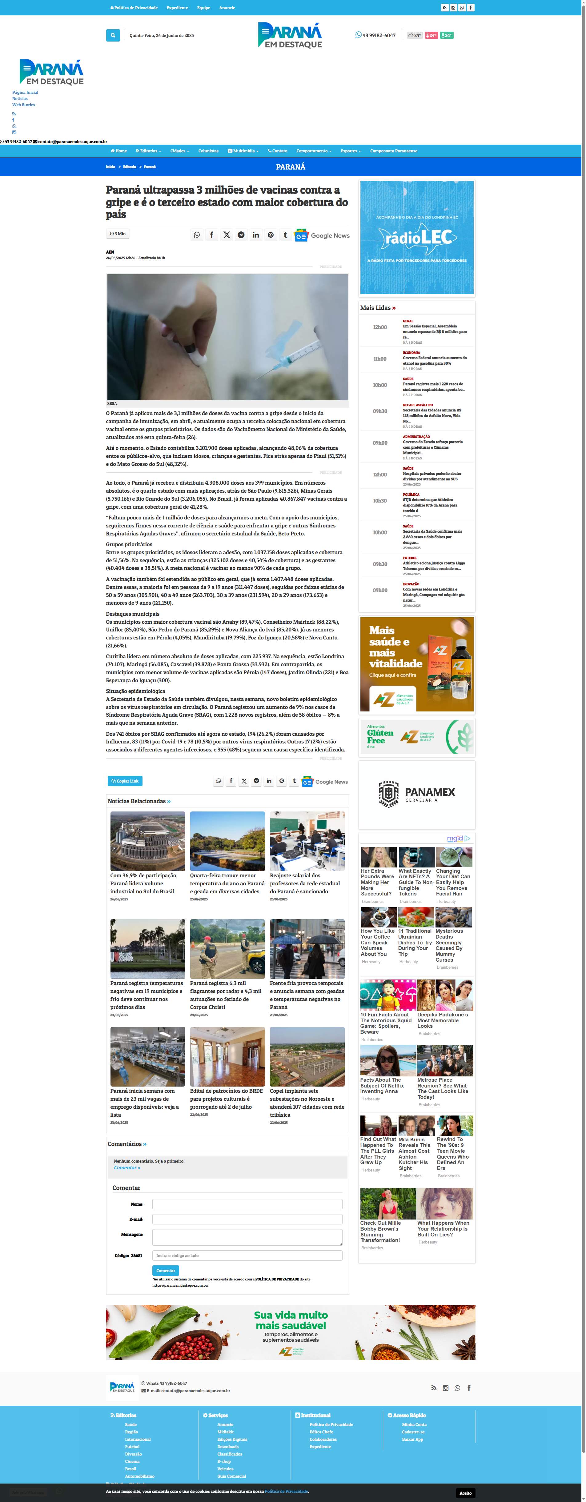 Paraná já recebeu e distribuiu 4.308.000 doses aos 399 municípios. Em números absolutos, é o quarto estado com mais aplicações, atrás de São Paulo (9.815.326), Minas Gerais (5.750.166) e Rio Grande do Sul (3.206.055). No Brasil, já foram aplicadas 40.867.847 vacinas contra a gripe, com uma cobertura geral de 41,28%.