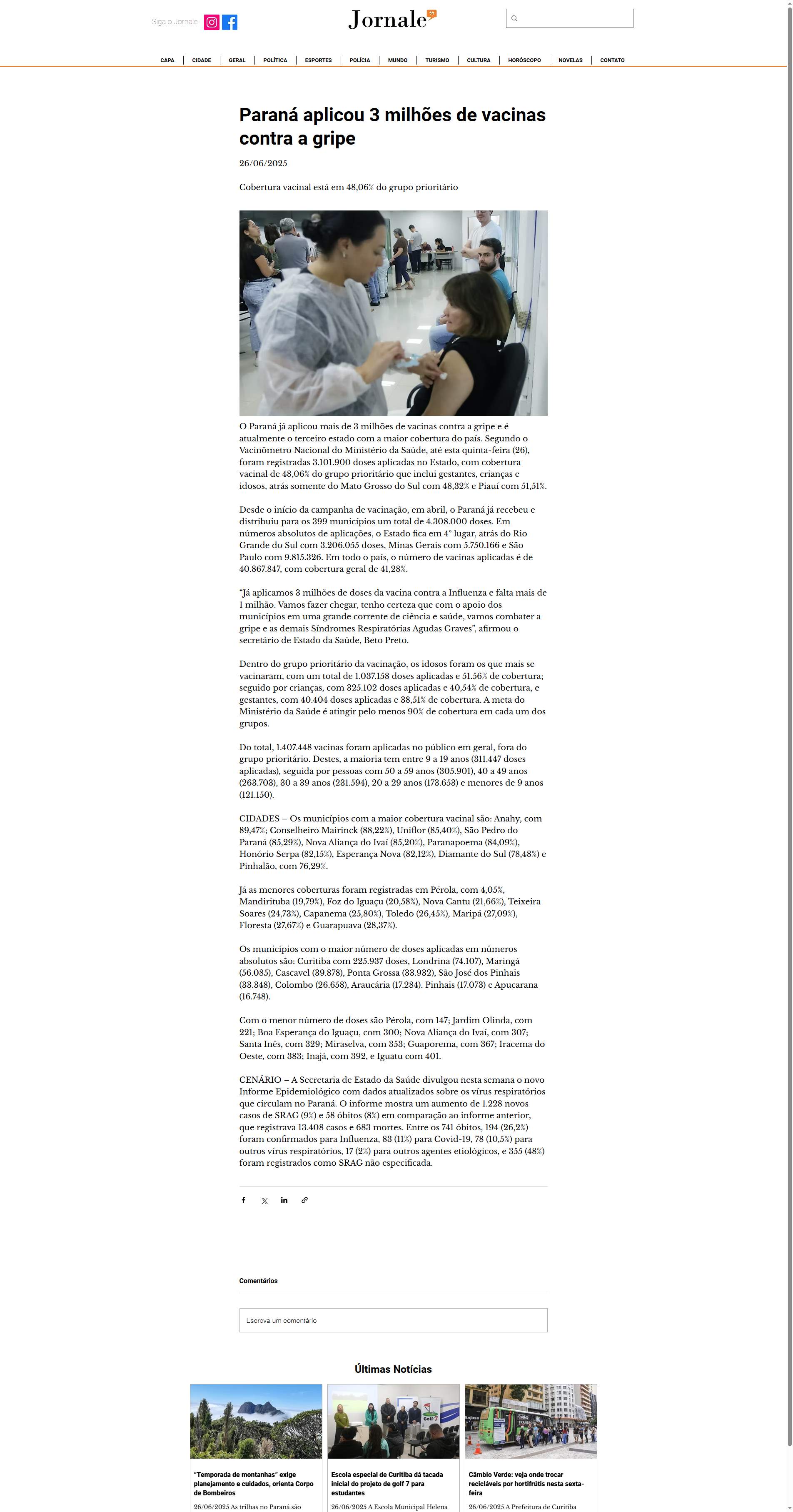 Paraná já aplicou mais de 3 milhões de vacinas contra a gripe e é atualmente o terceiro estado com a maior cobertura do país. Segundo o Vacinômetro Nacional do Ministério da