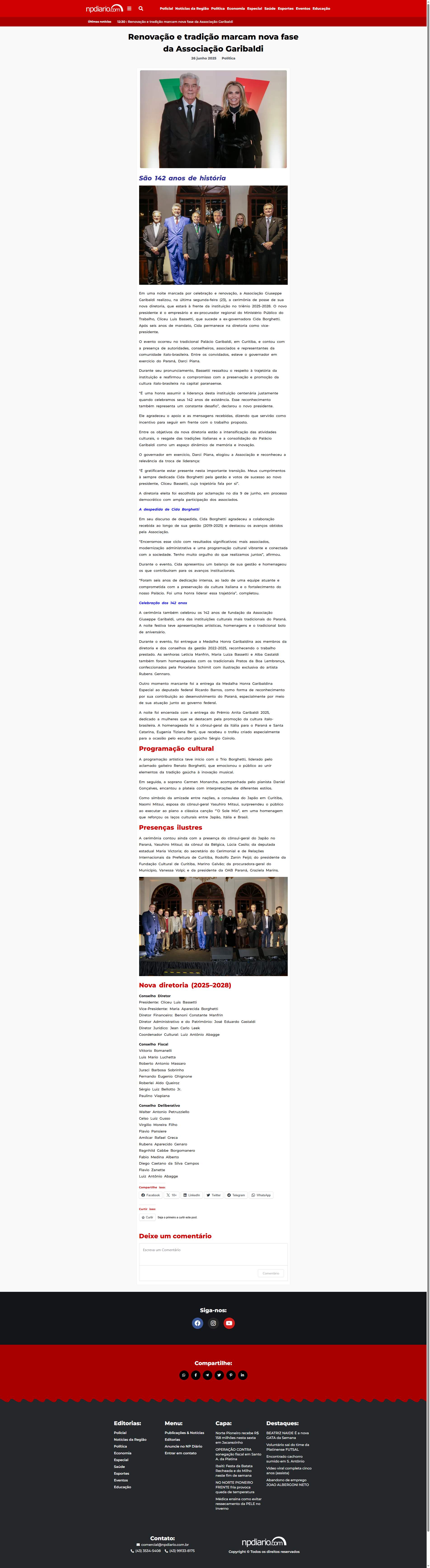 Em uma noite marcada por celebração e renovação, a Associação Giuseppe Garibaldi realizou, na última segunda-feira (23), a cerimônia de posse de sua nova diretoria, que estará à frente da instituição no triênio 2025-2028. O novo presidente é o empresário e ex-procurador regional do Ministério Público do Trabalho, Cliceu Luis Bassetti, que sucede a ex-governadora Cida Borghetti. Após seis anos de mandato, Cida permanece na diretoria como vice-presidente.