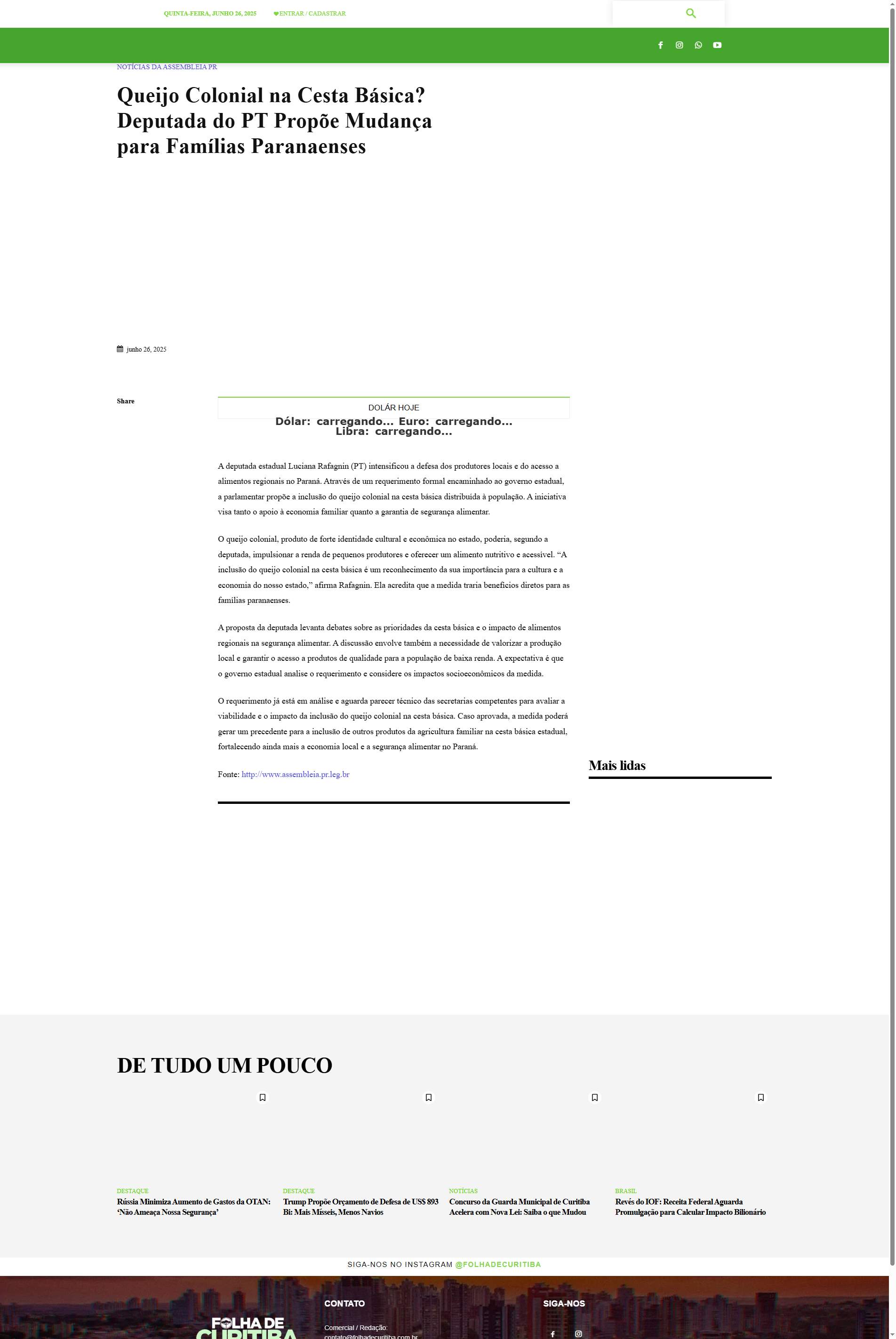 O requerimento já está em análise e aguarda parecer técnico das secretarias competentes para avaliar a viabilidade e o impacto da inclusão do queijo colonial na cesta básica. Caso aprovada, a medida poderá gerar um precedente para a inclusão de outros produtos da agricultura familiar na cesta básica estadual, fortalecendo ainda mais a economia local e a segurança alimentar no Paraná.