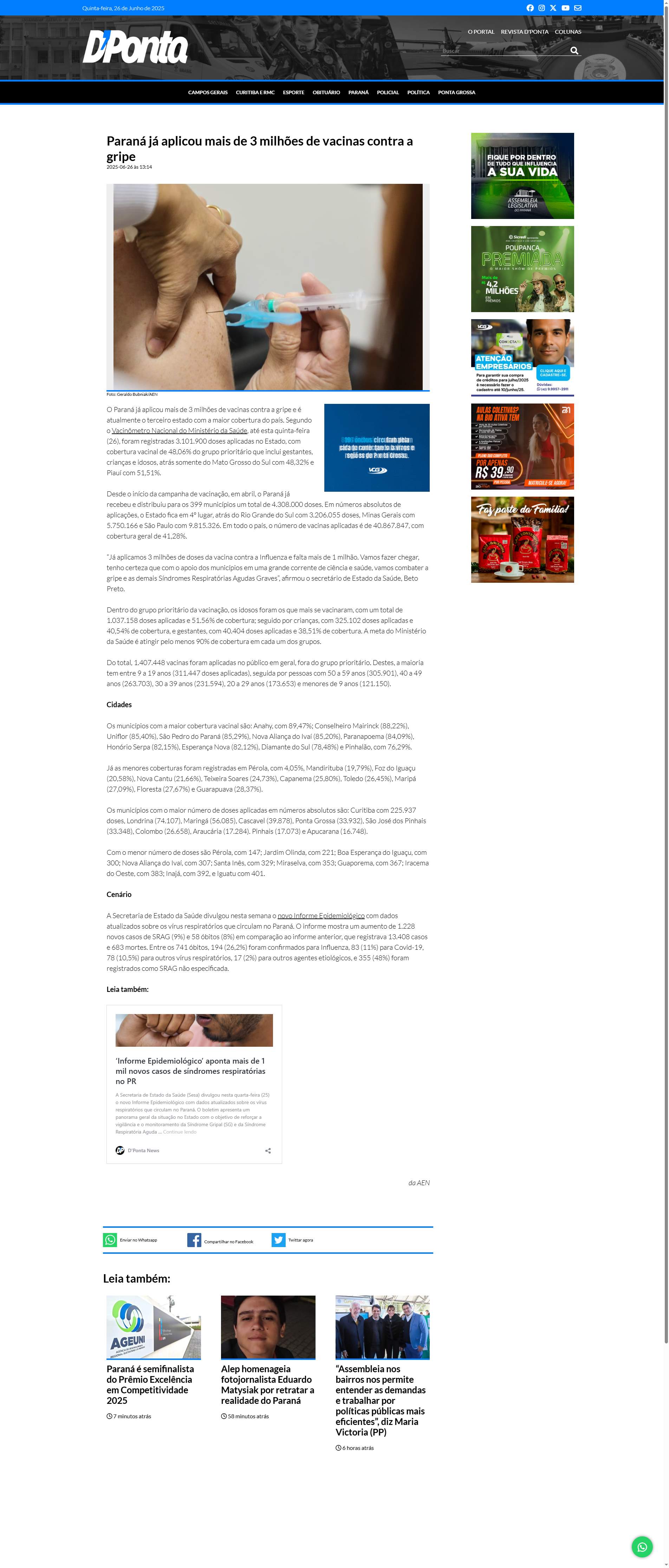 Paraná já aplicou mais de 3 milhões de vacinas contra a gripe e é atualmente o terceiro estado com a maior cobertura do país. Segundo o Vacinômetro Nacional do Ministério da