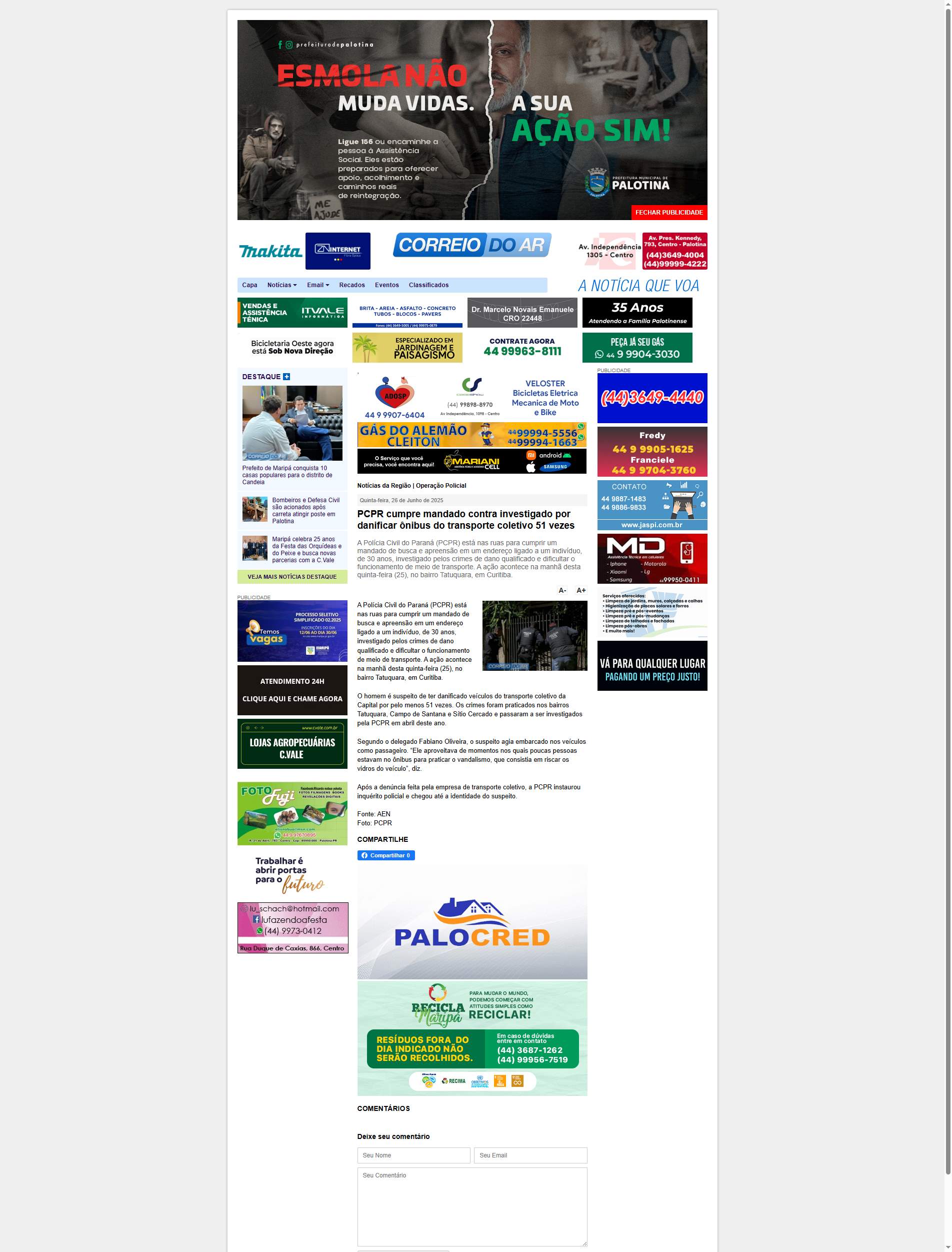 Polícia Civil do Paraná (PCPR) está nas ruas para cumprir um mandado de busca e apreensão em um endereço ligado a um indivíduo, de 30 anos, investigado pelos crimes de dano qualificado e dificultar o funcionamento de meio de transporte. A ação acontece na manhã desta quinta-feira (25), no bairro Tatuquara, em Curitiba.
