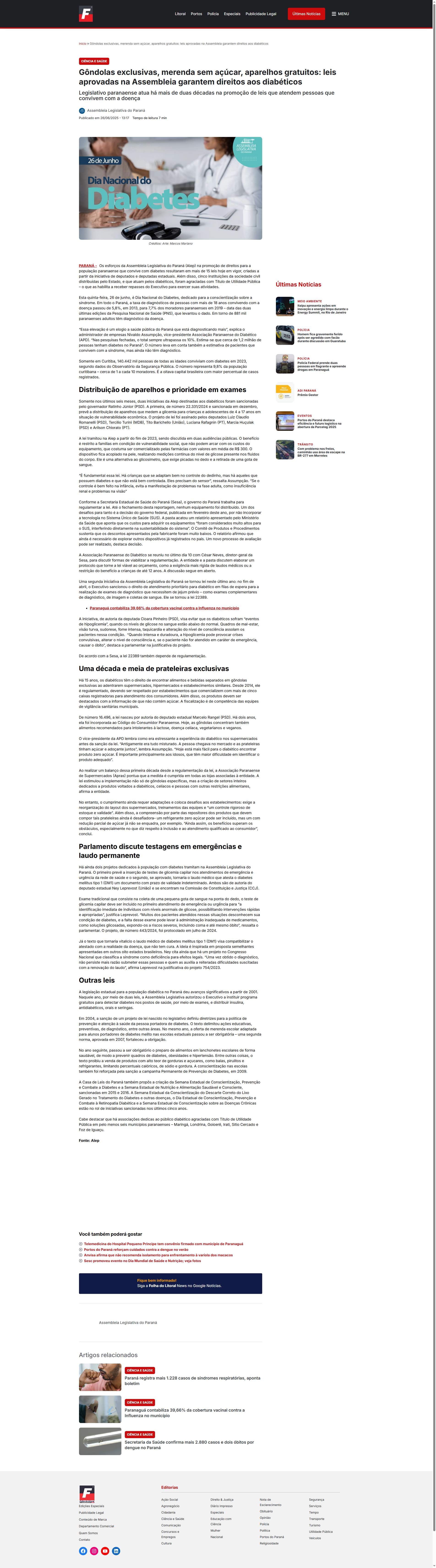 Paraná. O primeiro prevê a inserção de testes de glicemia capilar nos atendimentos de emergência e urgência da rede de saúde e o segundo, se aprovado, tornaria o laudo médico que atesta o diabetes mellitus tipo 1 (DM1) um documento com prazo de validade indeterminado. Ambos são de autoria do deputado estadual Ney Leprevost (União) e se encontram na Comissão de Constituição e Justiça (CCJ).