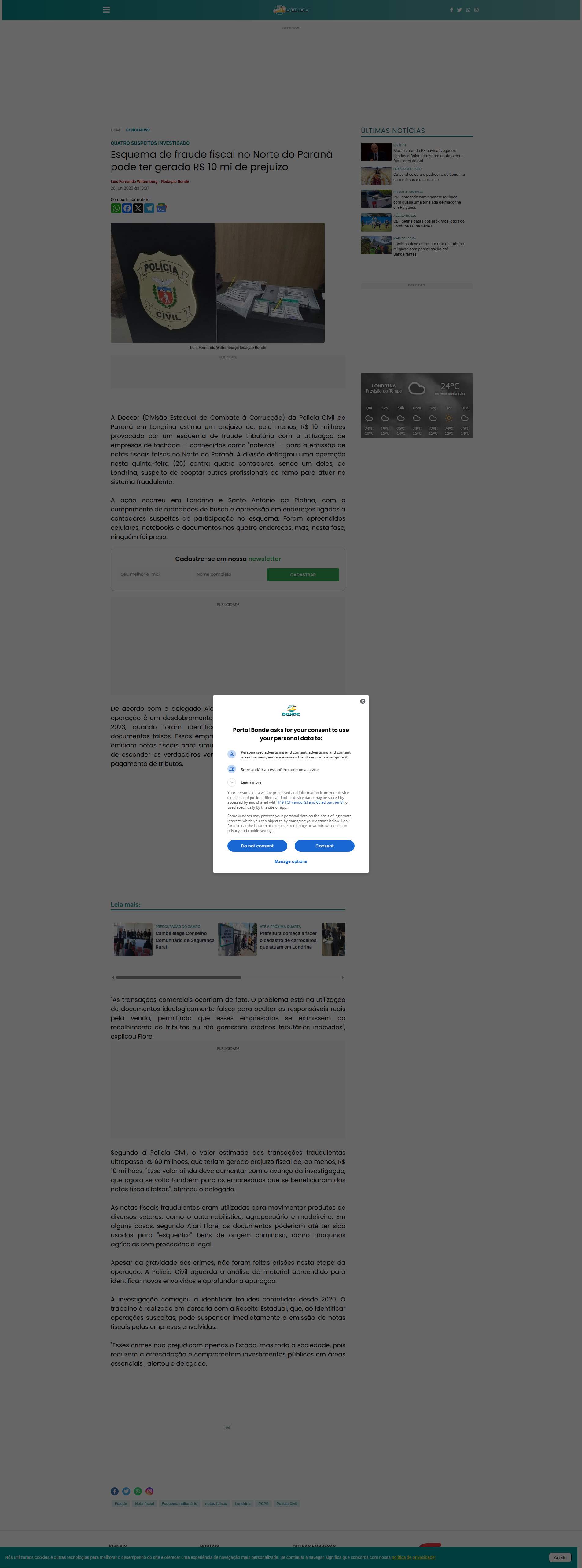 Polícia Civil do Paraná em Londrina estima um prejuízo de, pelo menos, R$ 10 milhões provocado por um esquema de fraude tributária com a utilização de empresas de fachada — conhecidas como "noteiras" — para a emissão de notas fiscais falsas no Norte do