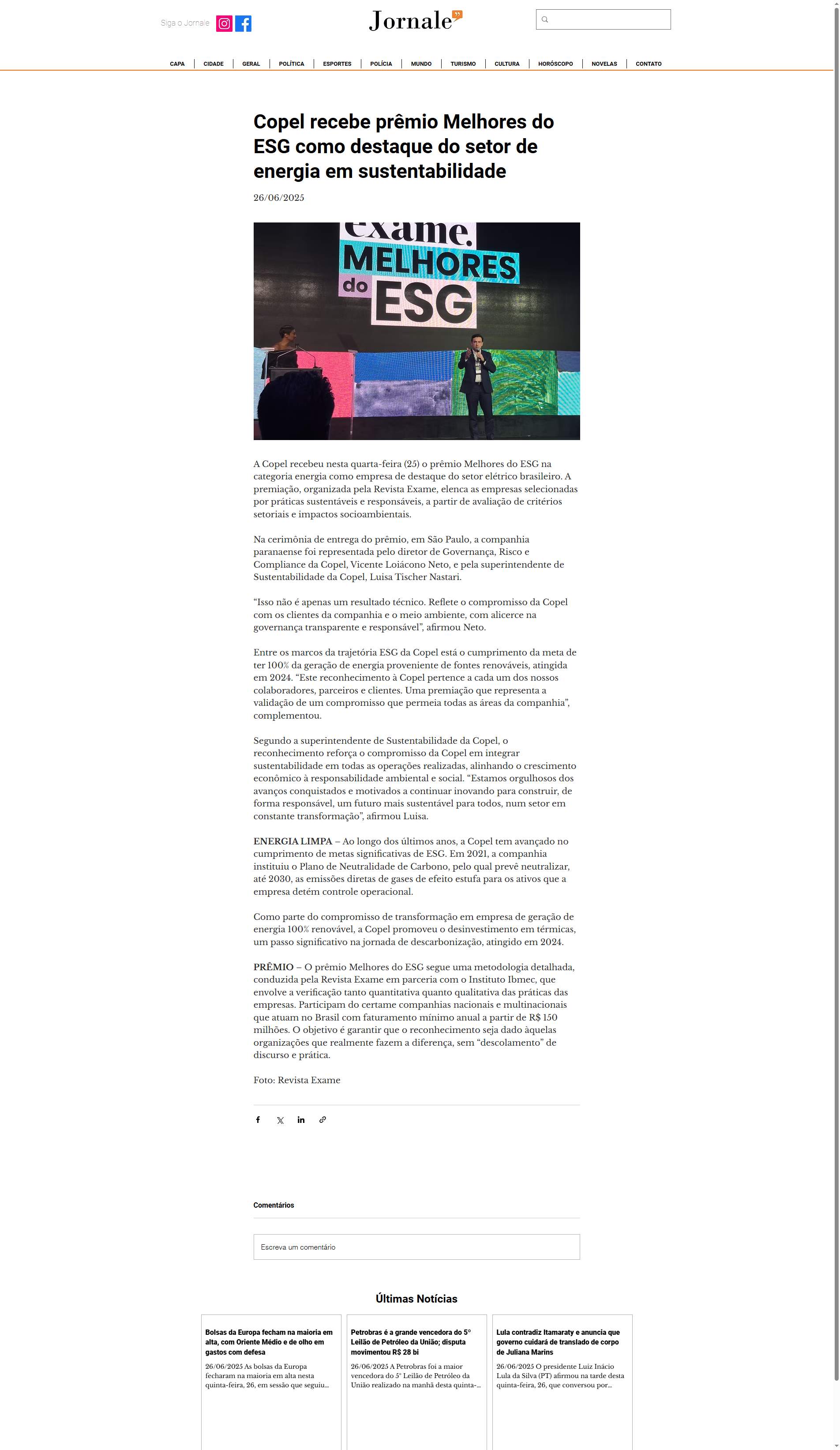 Copel recebeu nesta quarta-feira (25) o prêmio Melhores do ESG na categoria energia como empresa de destaque do setor elétrico brasileiro. A premiação, organizada pela Revista Exame, elenca as empresas selecionadas por práticas sustentáveis e responsáveis, a partir de avaliação de critérios setoriais e impactos socioambientais.