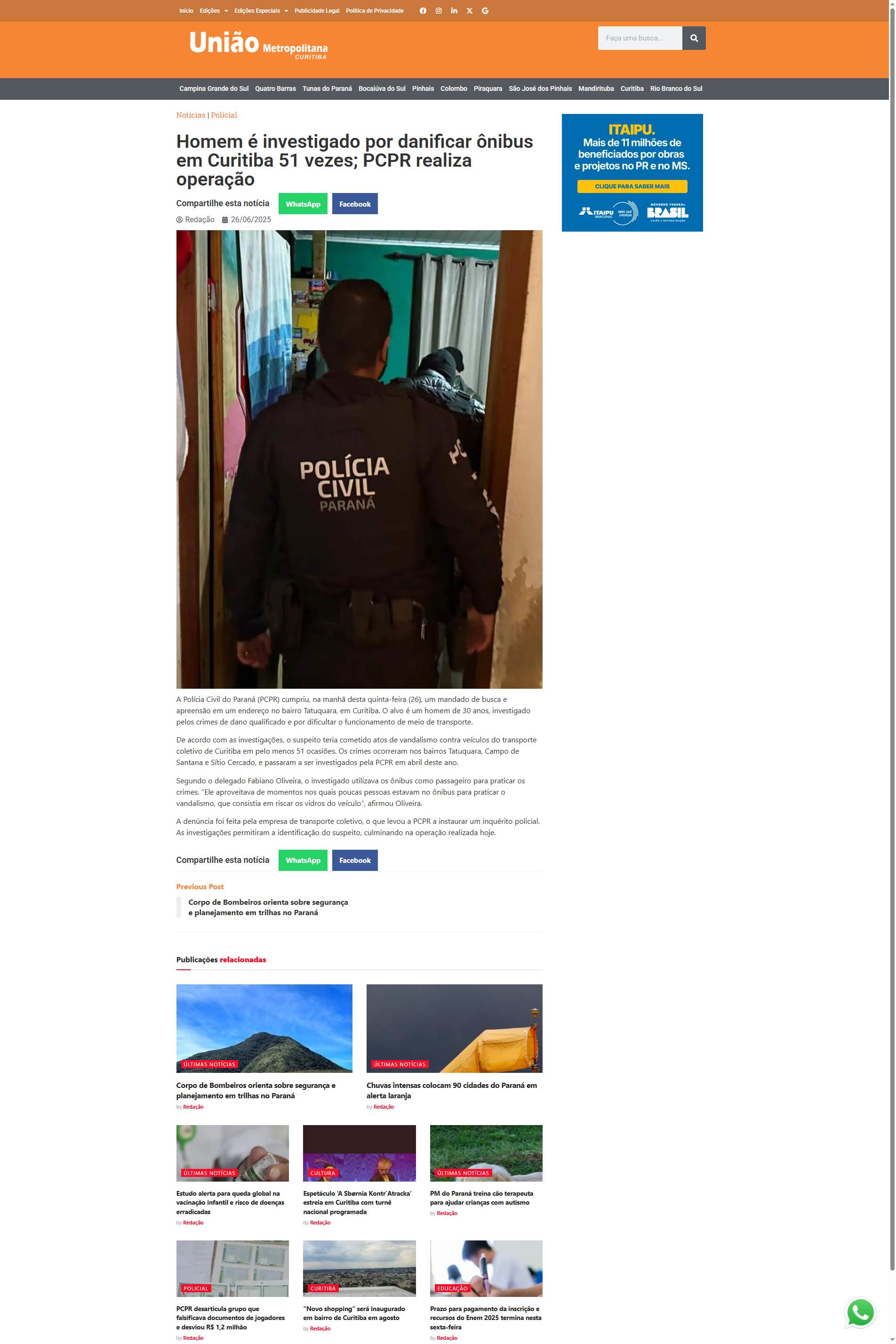 Polícia Civil do Paraná (PCPR) cumpriu, na manhã desta quinta-feira (26), um mandado de busca e apreensão em um endereço no bairro Tatuquara, em Curitiba. O alvo é um homem de 30 anos, investigado pelos crimes de dano qualificado e por dificultar o funcionamento de meio de transporte.