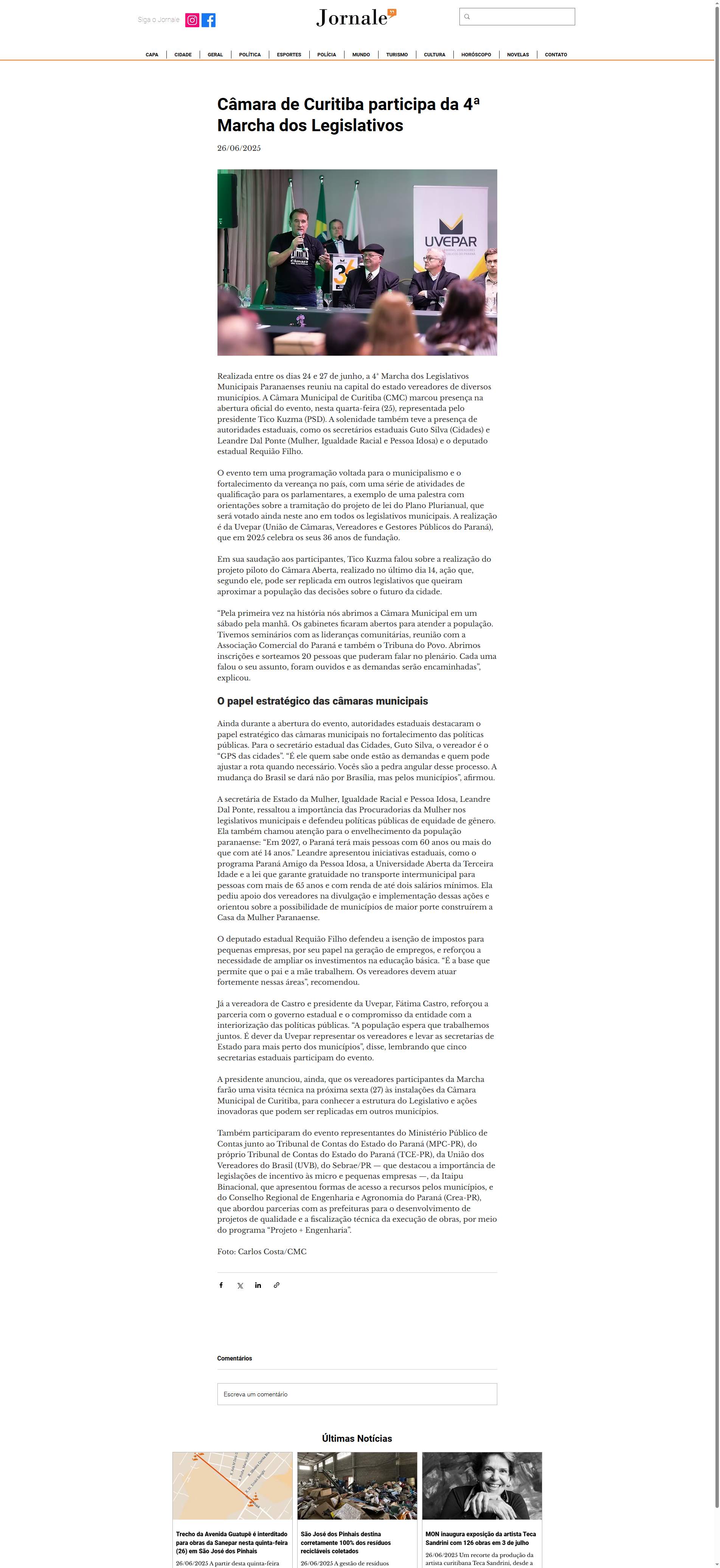 Realizada entre os dias 24 e 27 de junho, a 4ª Marcha dos Legislativos Municipais Paranaenses reuniu na capital do estado vereadores de diversos municípios. A Câmara Municipal de Curitiba (CMC) marcou presença na abertura oficial do evento, nesta quarta-feira (25), representada pelo presidente Tico Kuzma (PSD). A solenidade também teve a presença de autoridades estaduais, como os secretários estaduais