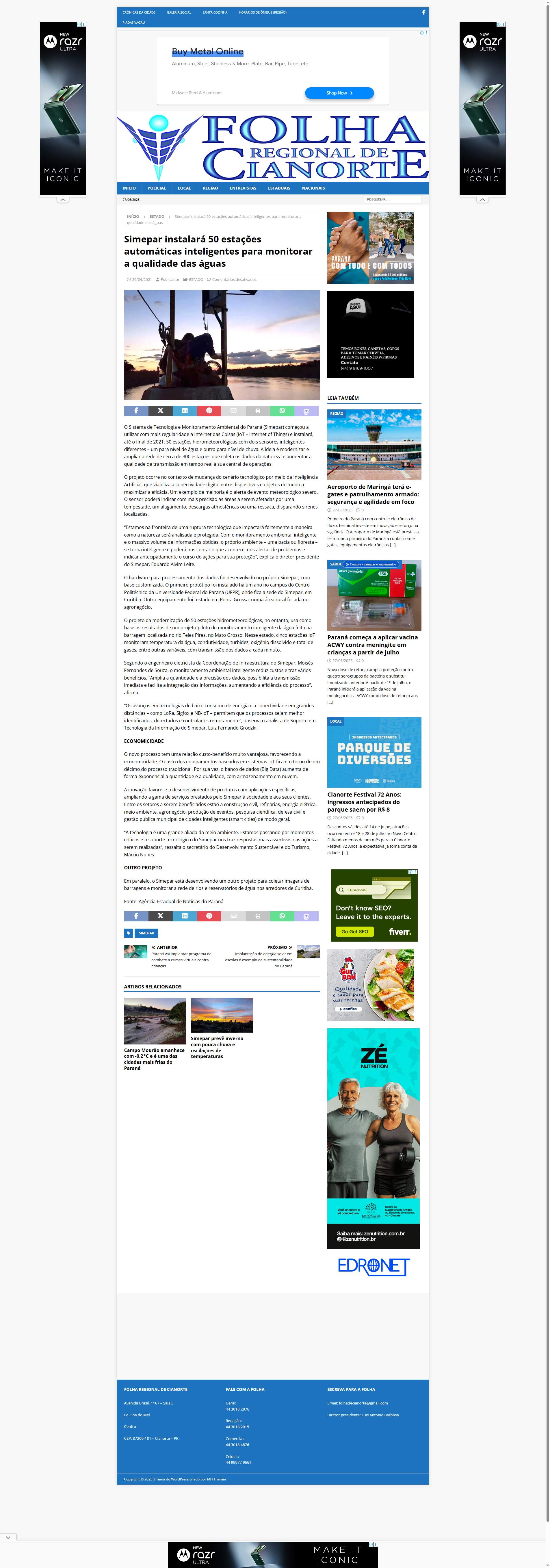 Monitoramento Ambiental do Paraná (Simepar) começou a utilizar com mais regularidade a Internet das Coisas (IoT - Internet of Things) e instalará, até o final de 2021, 50 estações hidrometeorológicas com dois sensores inteligentes diferentes - um para nível de água e outro para nível de chuva. A ideia é modernizar e ampliar a rede de cerca de 300 estações que coleta os dados da natureza e aumentar a qualidade de transmissão em tempo real à sua central de operações.