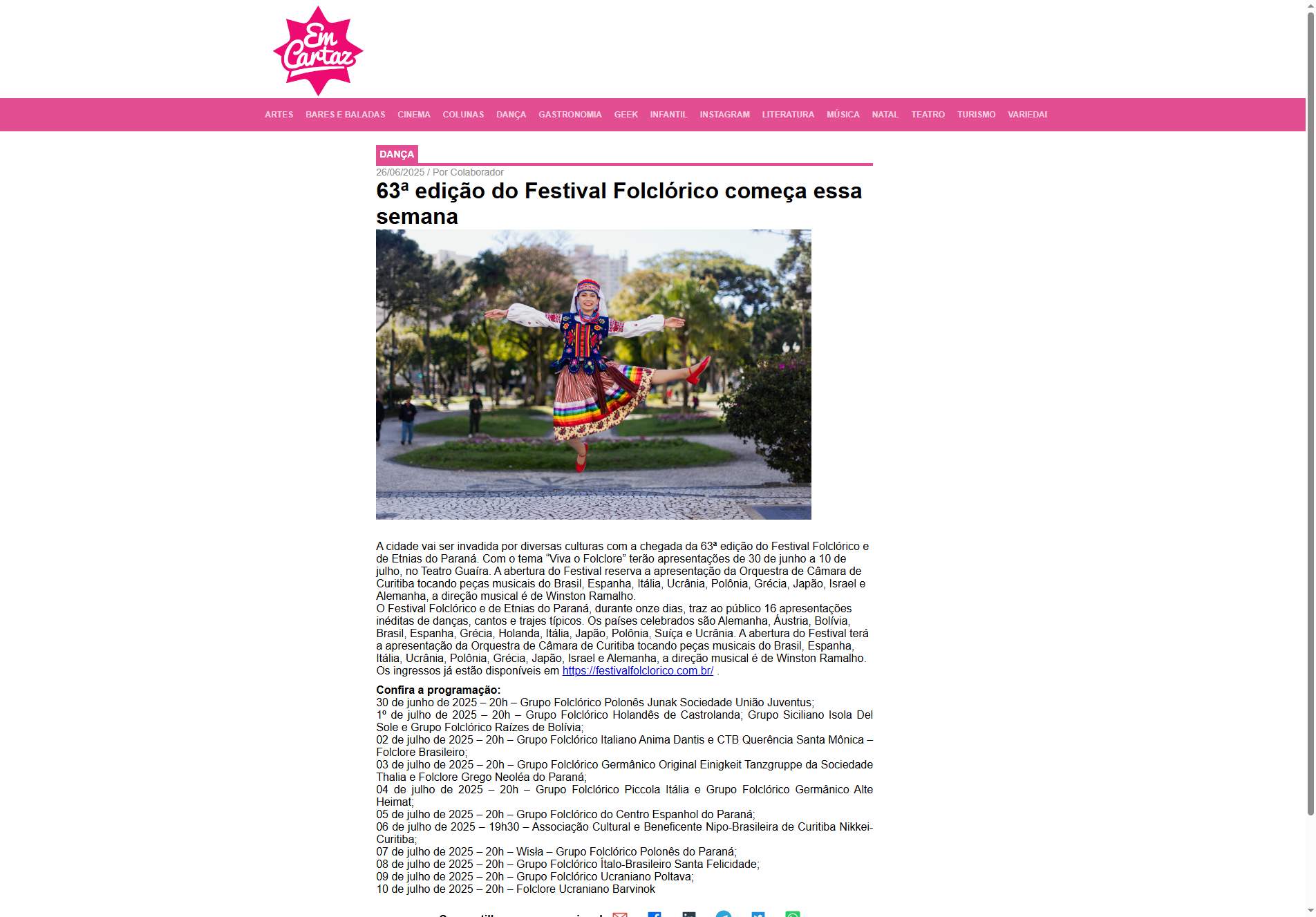 O Festival Folclórico e de Etnias do Paraná, durante onze dias, traz ao público 16 apresentações inéditas de danças, cantos e trajes típicos. Os países celebrados são Alemanha, Áustria, Bolívia, Brasil, Espanha, Grécia, Holanda, Itália, Japão, Polônia, Suíça e Ucrânia. A abertura do Festival terá a apresentação da Orquestra de Câmara de Curitiba tocando peças musicais do Brasil, Espanha, Itália, Ucrânia, Polônia, Grécia, Japão, Israel e Alemanha, a direção musical é de Winston Ramalho. Os ingressos já estão disponíveis em https://festivalfolclorico.com.br/ .