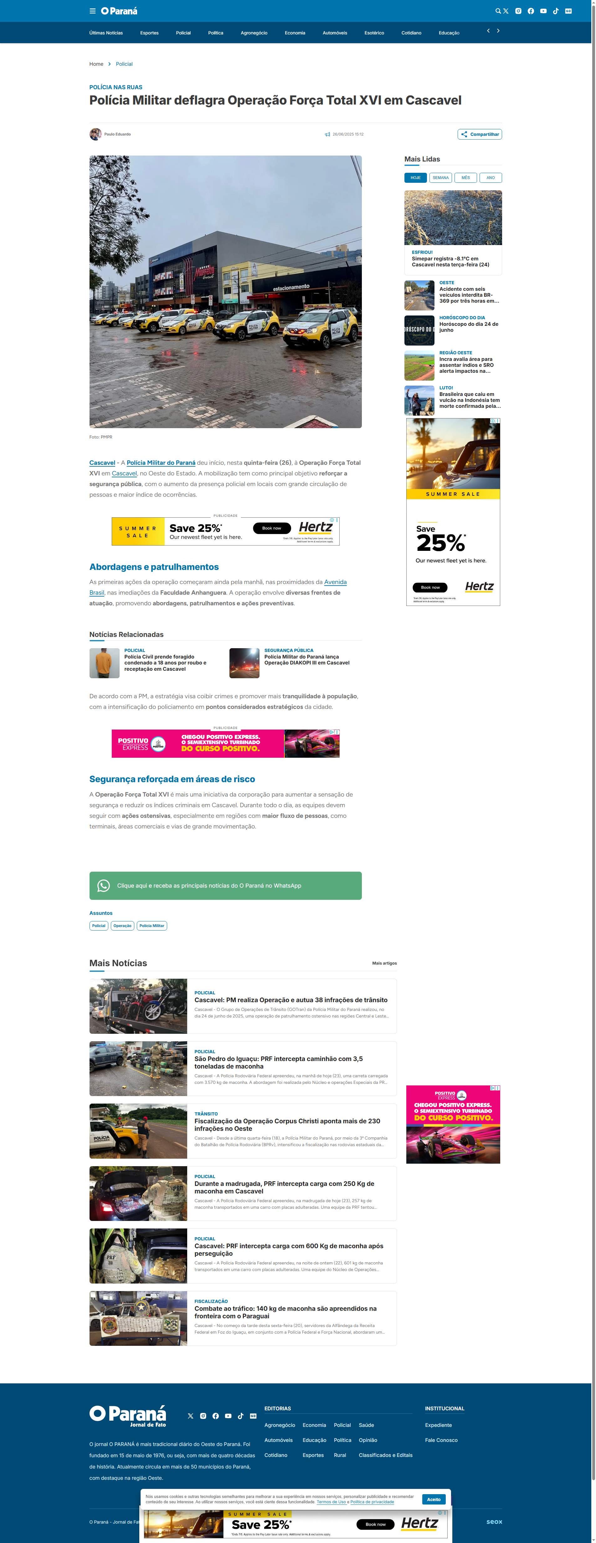 Operação Força Total XVI em Cascavel, no Oeste do Estado. A mobilização tem como principal objetivo reforçar a segurança pública, com o aumento da presença policial em locais com grande circulação de pessoas e maior índice de ocorrências.