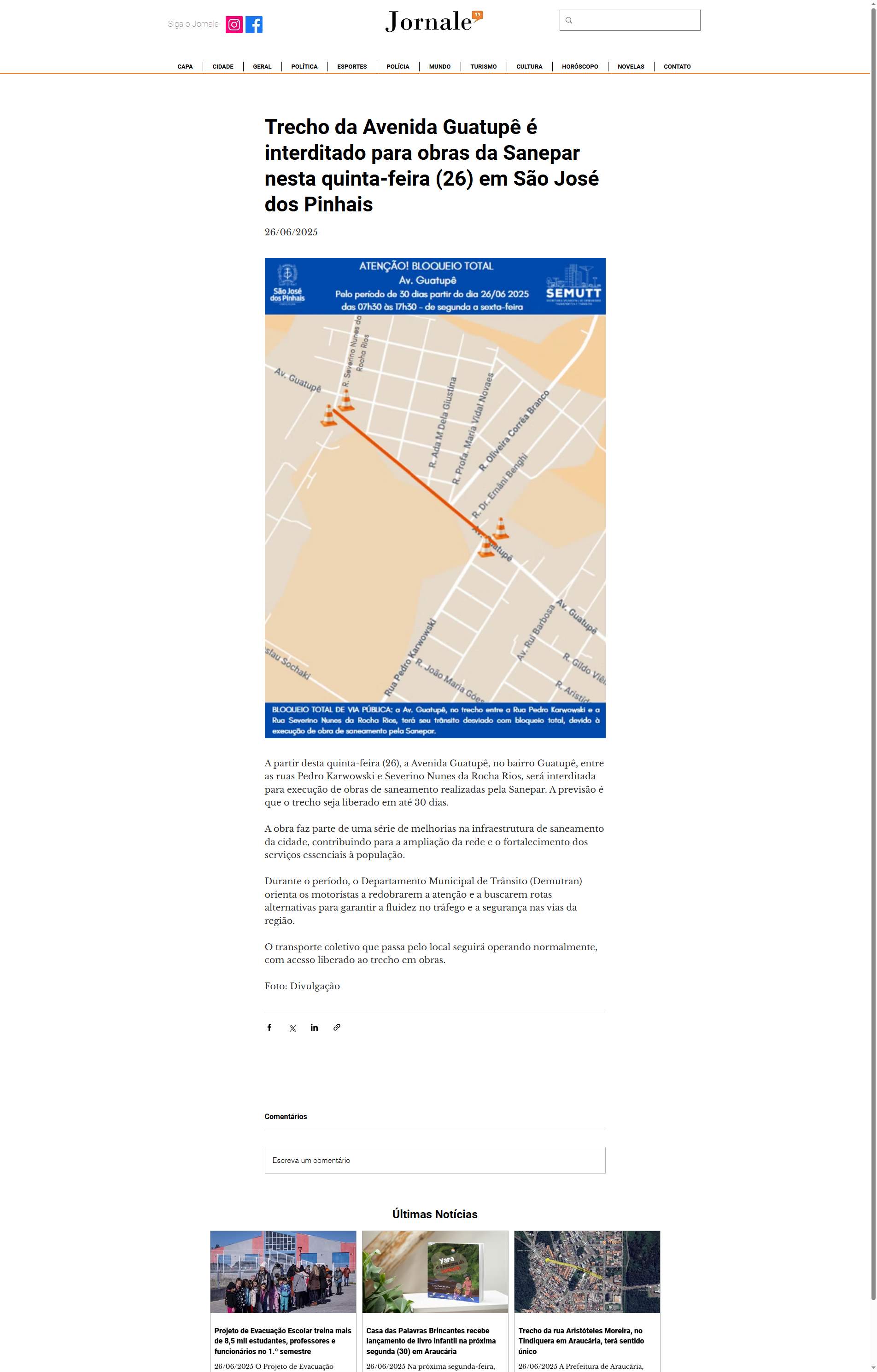 A partir desta quinta-feira (26), a Avenida Guatupê, no bairro Guatupê, entre as ruas Pedro Karwowski e Severino Nunes da Rocha Rios, será interditada para execução de obras de saneamento realizadas pela