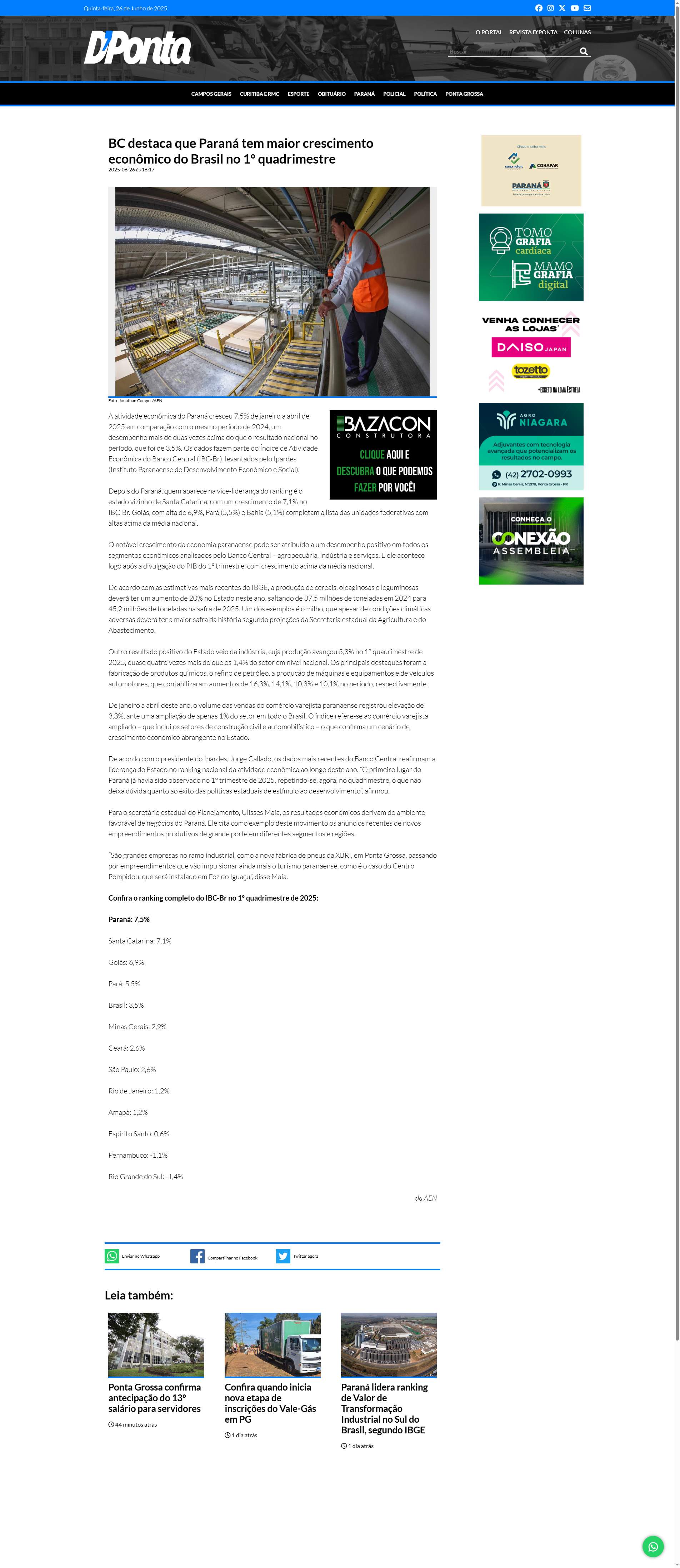 Ipardes, Jorge Callado, os dados mais recentes do Banco Central reafirmam a liderança do Estado no ranking nacional da atividade econômica ao longo deste ano. “O primeiro lugar do Paraná já havia sido observado no 1º trimestre de 2025, repetindo-se, agora, no quadrimestre, o que não deixa dúvida quanto ao êxito das políticas estaduais de estímulo ao desenvolvimento”, afirmou.
