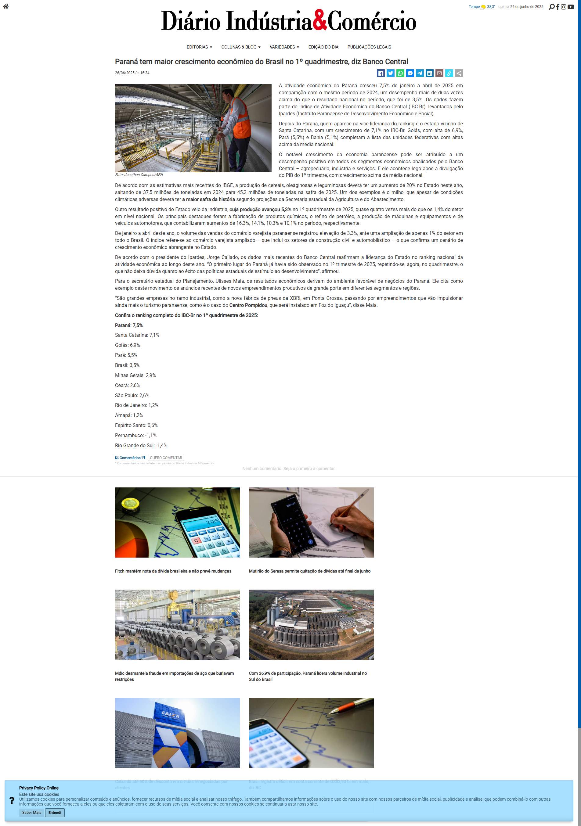 Ipardes, Jorge Callado, os dados mais recentes do Banco Central reafirmam a liderança do Estado no ranking nacional da atividade econômica ao longo deste ano. “O primeiro lugar do Paraná já havia sido observado no 1º trimestre de 2025, repetindo-se, agora, no quadrimestre, o que não deixa dúvida quanto ao êxito das políticas estaduais de estímulo ao desenvolvimento”, afirmou.