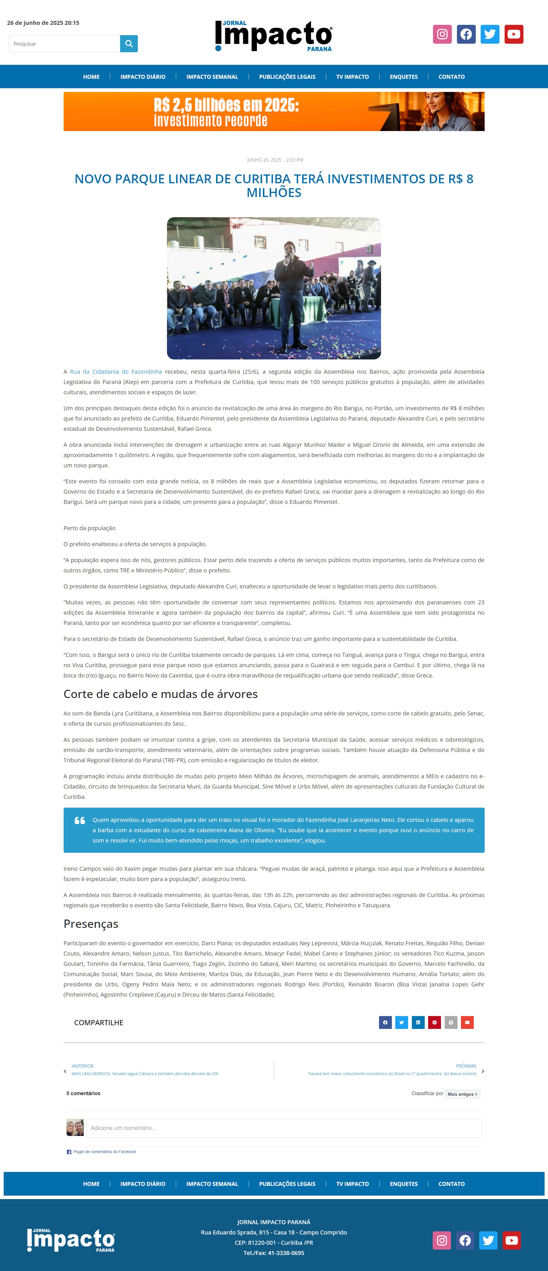 Governo do Estado e a Secretaria de Desenvolvimento Sustentável, do ex-prefeito Rafael Greca, vai mandar para a drenagem e revitalização ao longo do Rio Barigui. Será um parque novo para a cidade, um presente para a população”, disse o Eduardo Pimentel.