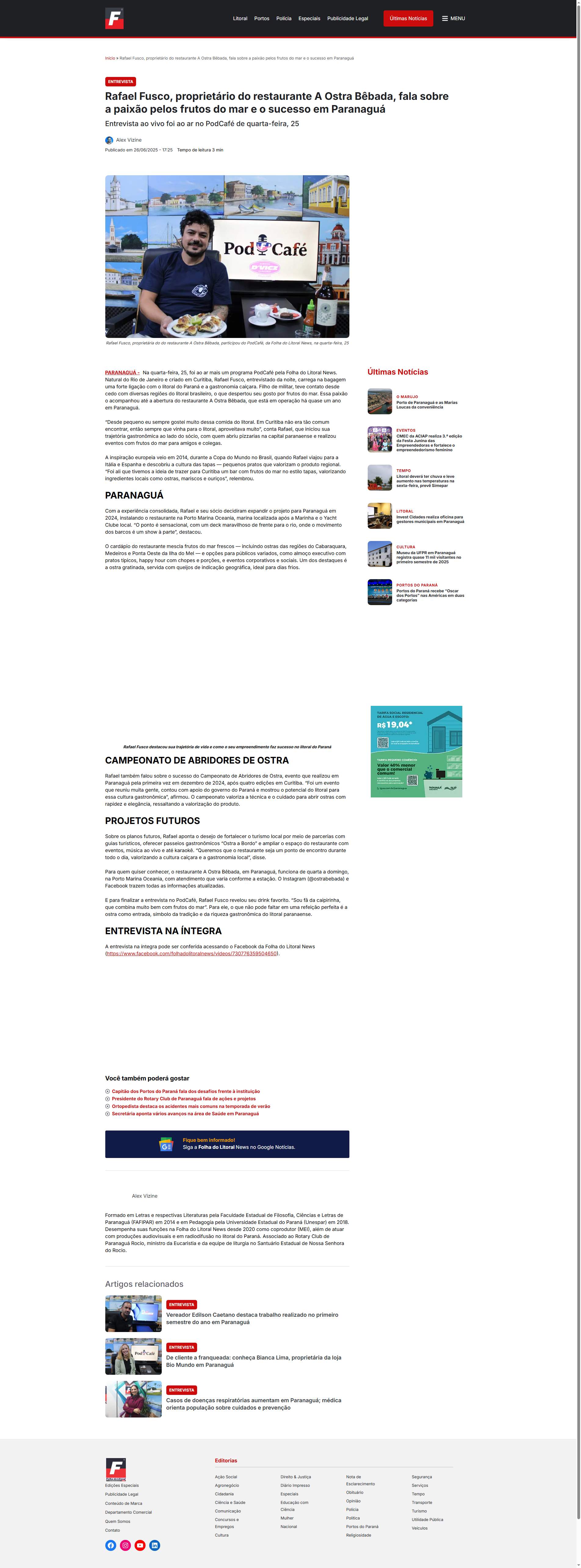 Rafael Fusco, proprietário do restaurante A Ostra Bêbada, fala sobre a paixão pelos frutos do mar e o sucesso em Paranaguá
