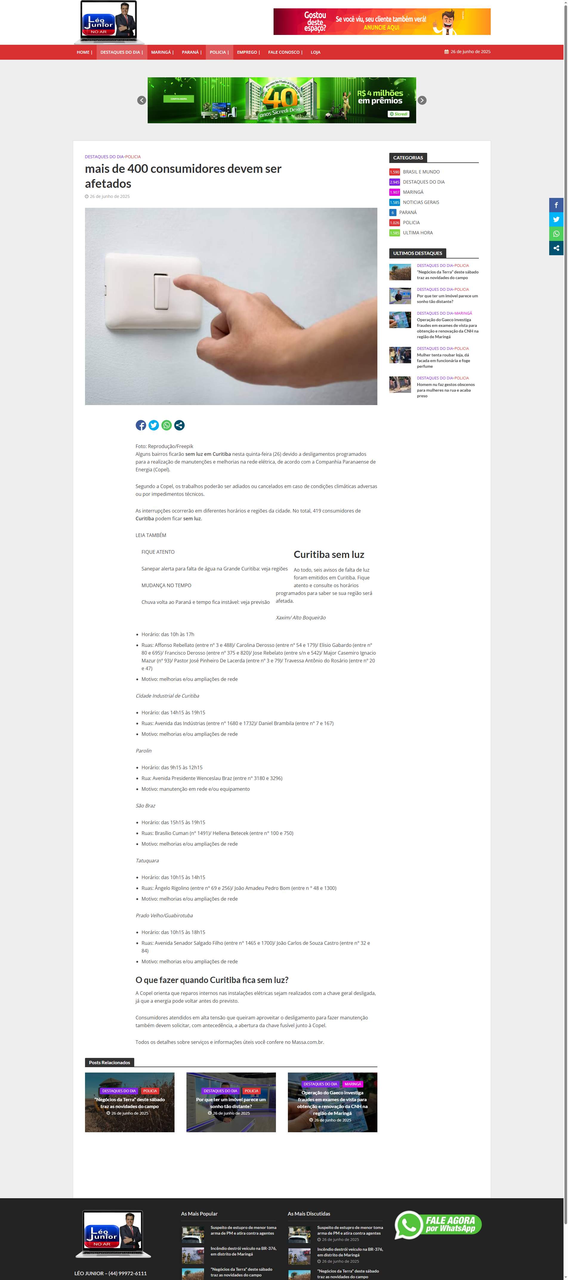 Horário: das 10h15 às 18h15 Ruas: Avenida Senador Salgado Filho (entre n° 1465 e 1700)/ João Carlos de Souza Castro (entre n° 32 e 84) Motivo: melhorias e/ou ampliações de rede O que fazer quando Curitiba fica sem luz?