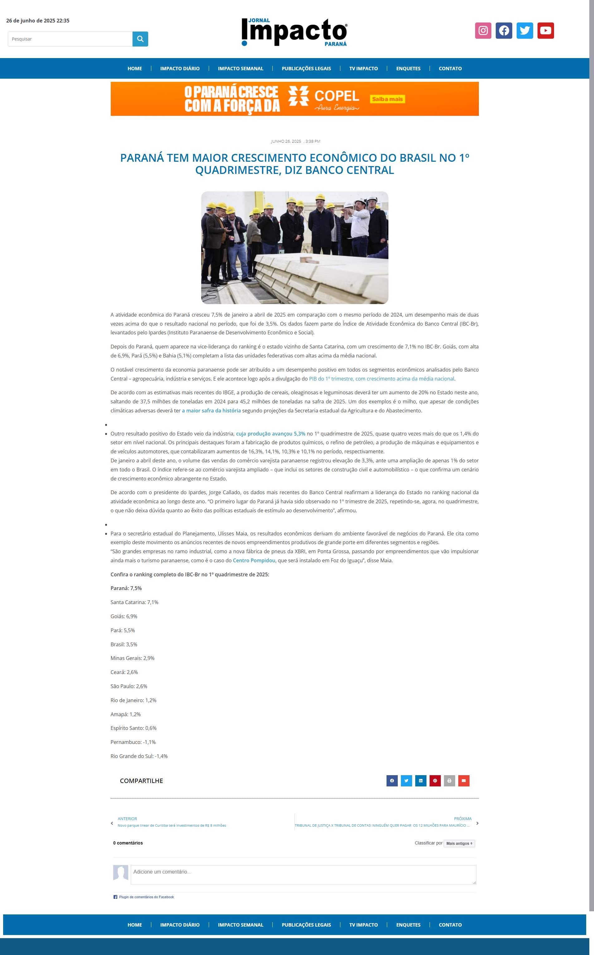 Ipardes, Jorge Callado, os dados mais recentes do Banco Central reafirmam a liderança do Estado no ranking nacional da atividade econômica ao longo deste ano. “O primeiro lugar do Paraná já havia sido observado no 1º trimestre de 2025, repetindo-se, agora, no quadrimestre, o que não deixa dúvida quanto ao êxito das políticas estaduais de estímulo ao desenvolvimento”, afirmou.