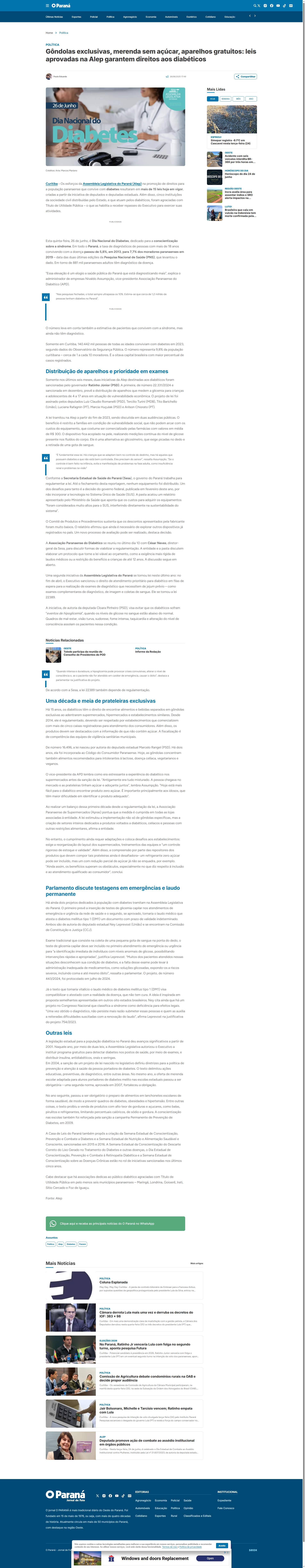 governador Ratinho Júnior (PSD). A primeira, de número 22.331/2024 e sancionada em dezembro, prevê a distribuição de aparelhos que medem a glicemia para crianças e adolescentes de 4 a 17 anos em situação de vulnerabilidade econômica. O projeto de lei foi assinado pelos