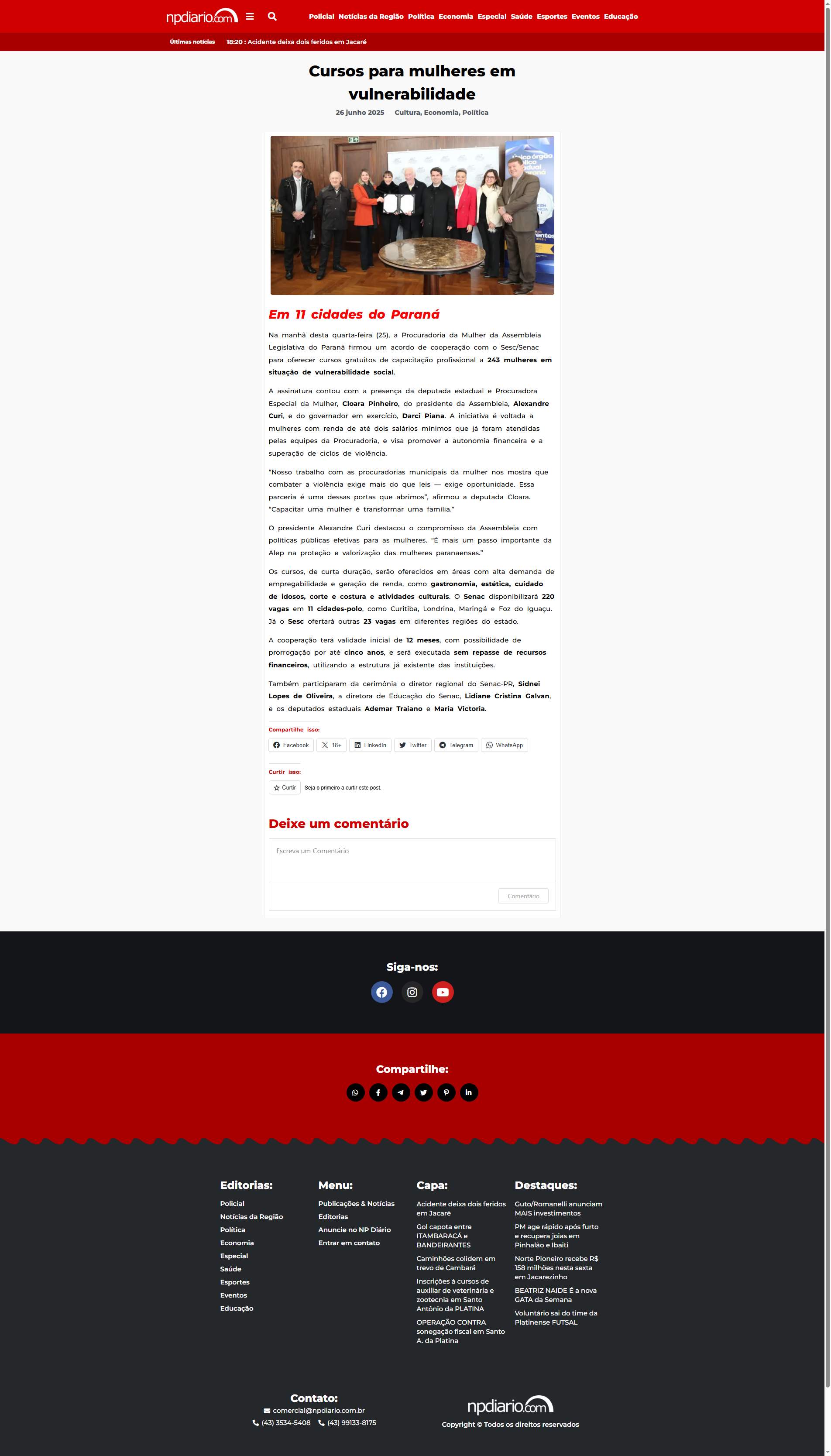 Na manhã desta quarta-feira (25), a Procuradoria da Mulher da Assembleia Legislativa do Paraná firmou um acordo de cooperação com o Sesc/Senac para oferecer cursos gratuitos de capacitação profissional a 243 mulheres em situação de vulnerabilidade social.