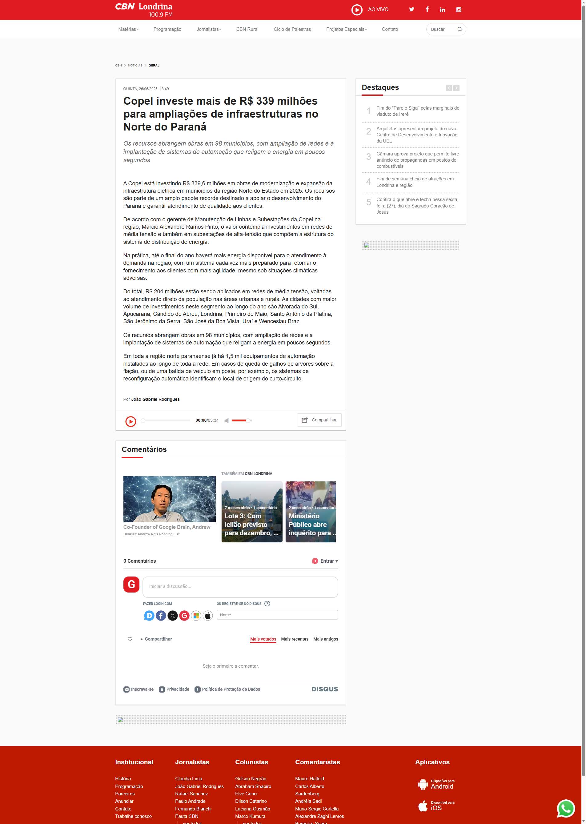 Copel está investindo R$ 339,6 milhões em obras de modernização e expansão da infraestrutura elétrica em municípios da região Norte do Estado em 2025. Os recursos são parte de um amplo pacote recorde destinado a apoiar o desenvolvimento do Paraná e garantir atendimento de qualidade aos clientes.