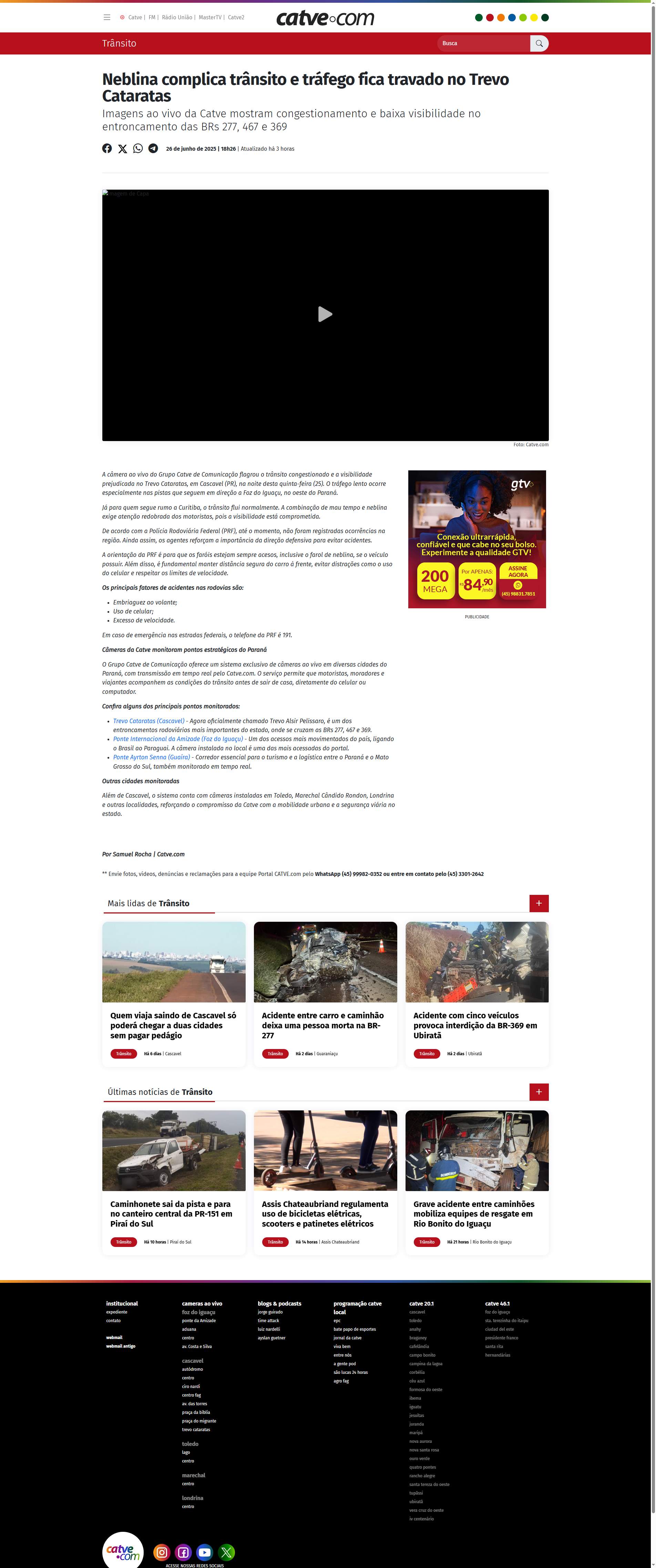 Paraná, com transmissão em tempo real pelo Catve.com. O serviço permite que motoristas, moradores e viajantes acompanhem as condições do trânsito antes de sair de casa, diretamente do celular ou computador.
