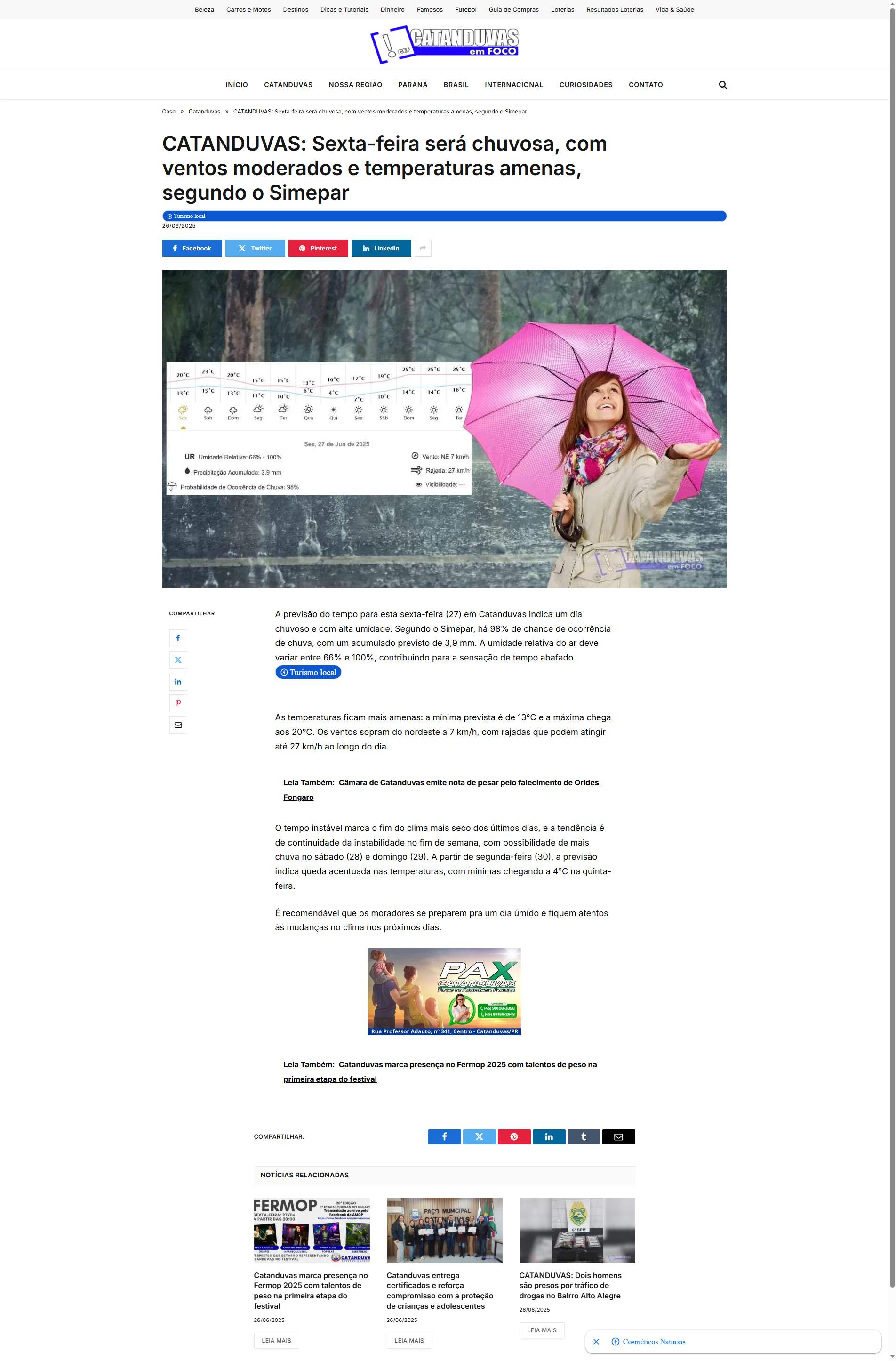 A previsão do tempo para esta sexta-feira (27) em Catanduvas indica um dia chuvoso e com alta umidade. Segundo o