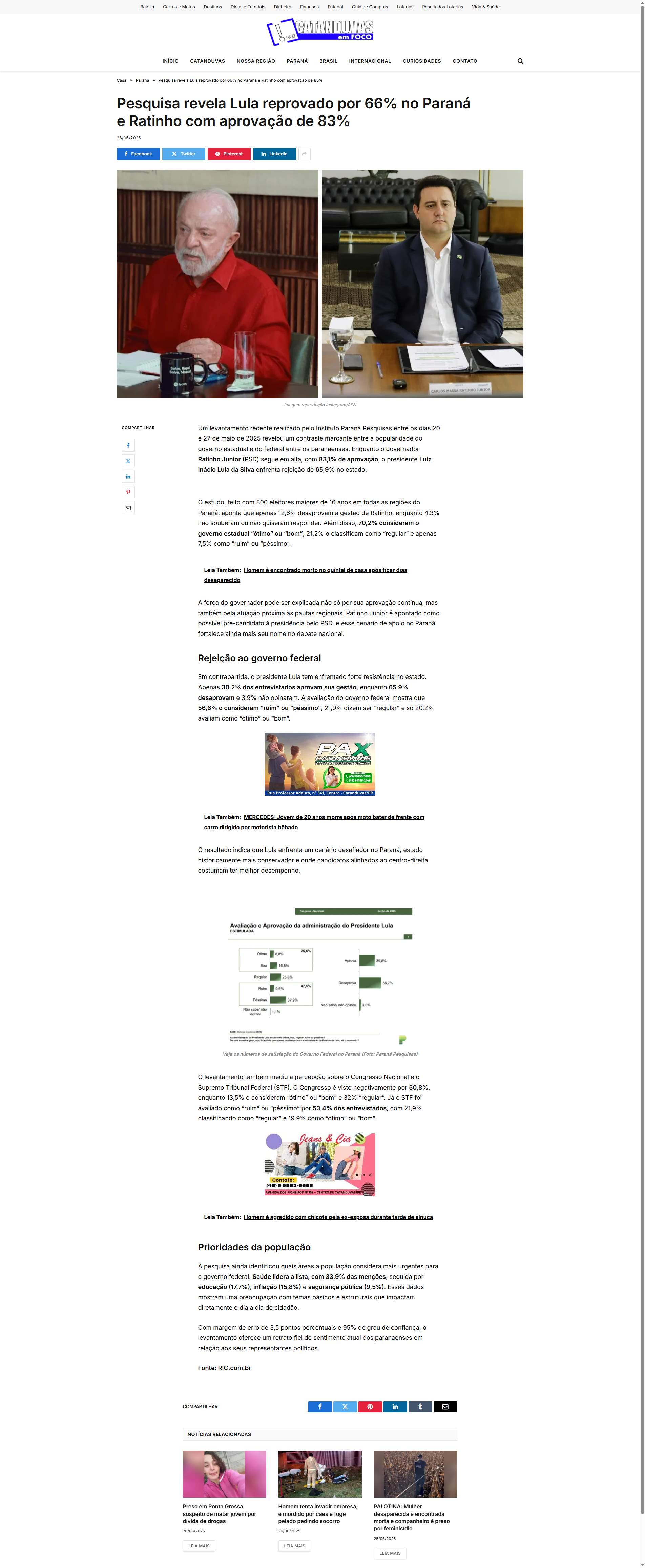 governador Ratinho Junior (PSD) segue em alta, com 83,1% de aprovação, o presidente Luiz Inácio Lula da Silva enfrenta rejeição de 65,9% no estado.
