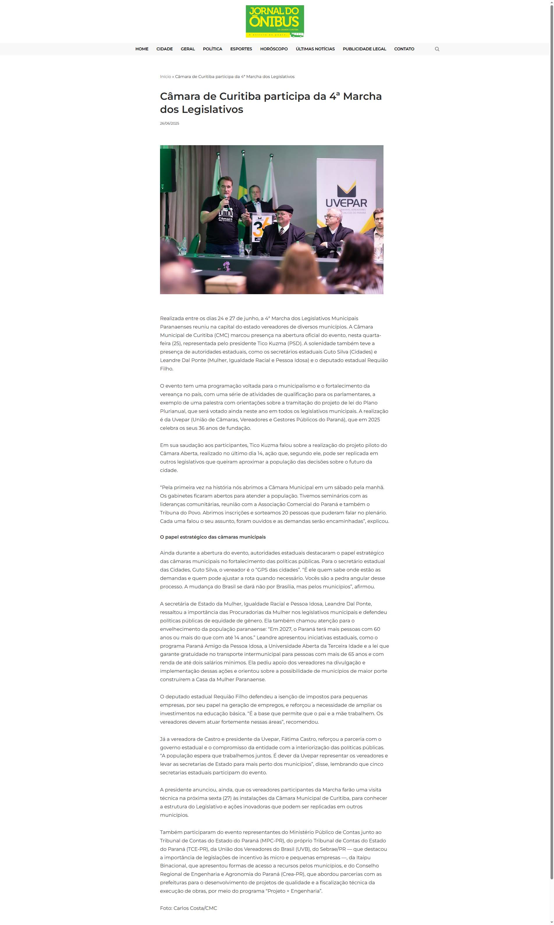 Realizada entre os dias 24 e 27 de junho, a 4ª Marcha dos Legislativos Municipais Paranaenses reuniu na capital do estado vereadores de diversos municípios. A Câmara Municipal de Curitiba (CMC) marcou presença na abertura oficial do evento, nesta quarta-feira (25), representada pelo presidente Tico Kuzma (PSD). A solenidade também teve a presença de autoridades estaduais, como os secretários estaduais