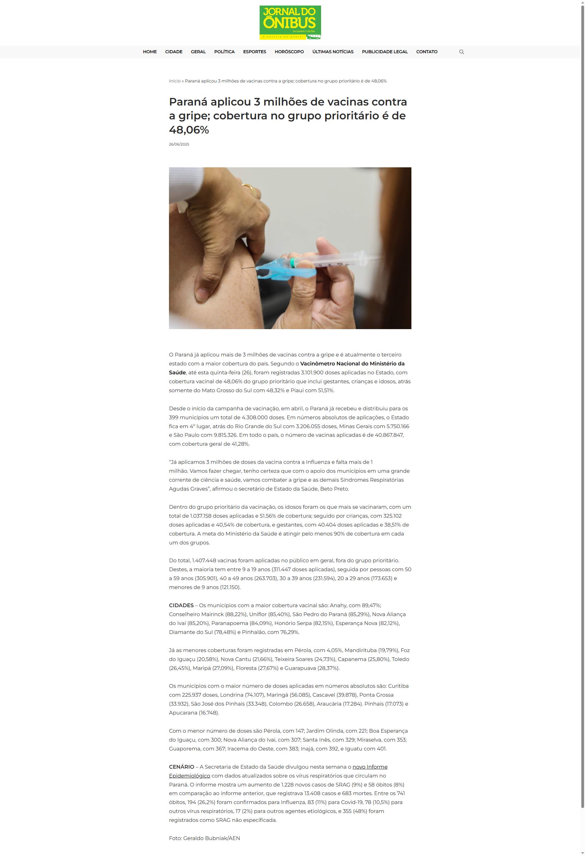 Paraná já aplicou mais de 3 milhões de vacinas contra a gripe e é atualmente o terceiro estado com a maior cobertura do país. Segundo o Vacinômetro Nacional do Ministério da