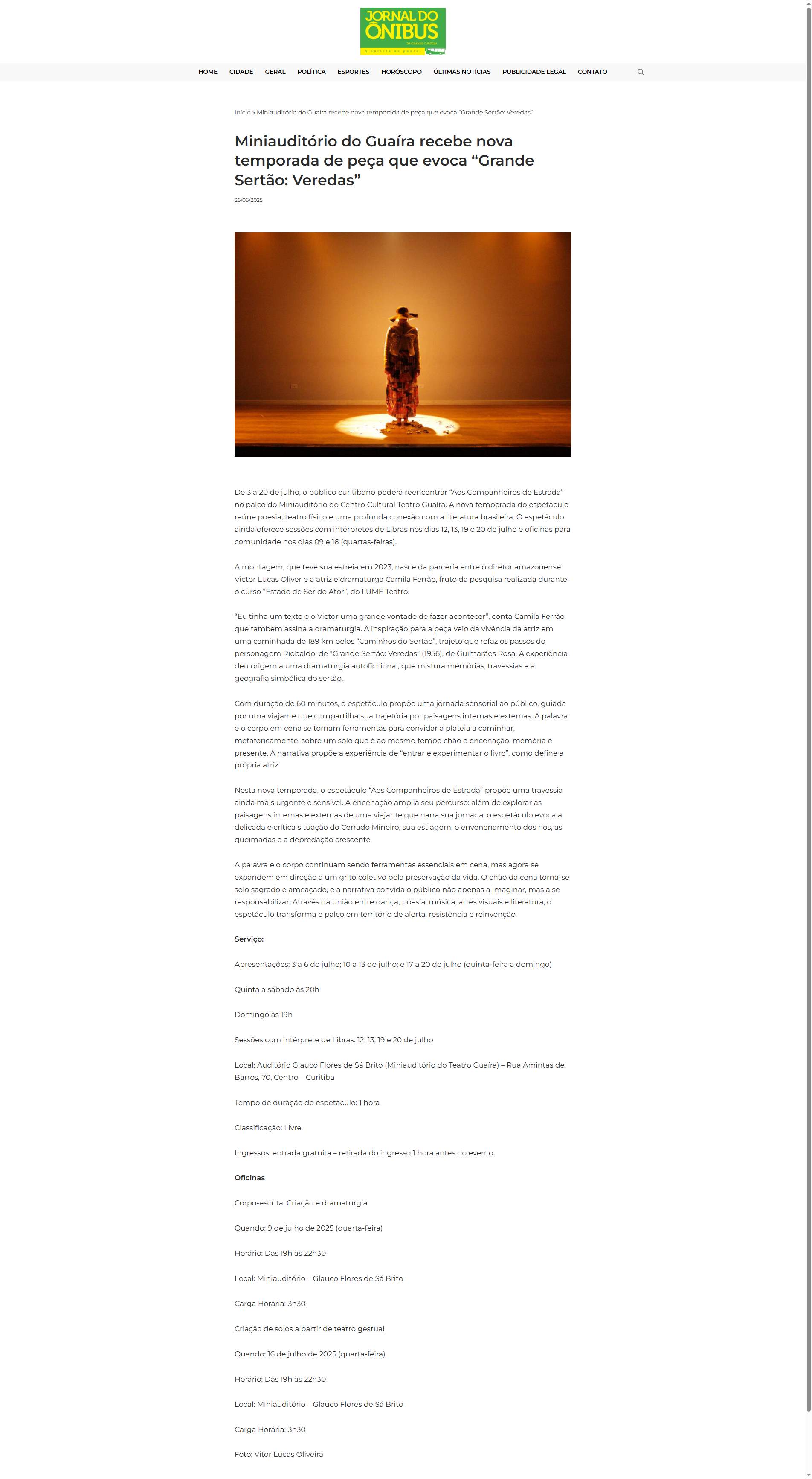 Centro Cultural Teatro Guaíra. A nova temporada do espetáculo reúne poesia, teatro físico e uma profunda conexão com a literatura brasileira. O espetáculo ainda oferece sessões com intérpretes de Libras nos dias 12, 13, 19 e 20 de julho e oficinas para comunidade nos dias 09 e 16 (quartas-feiras).