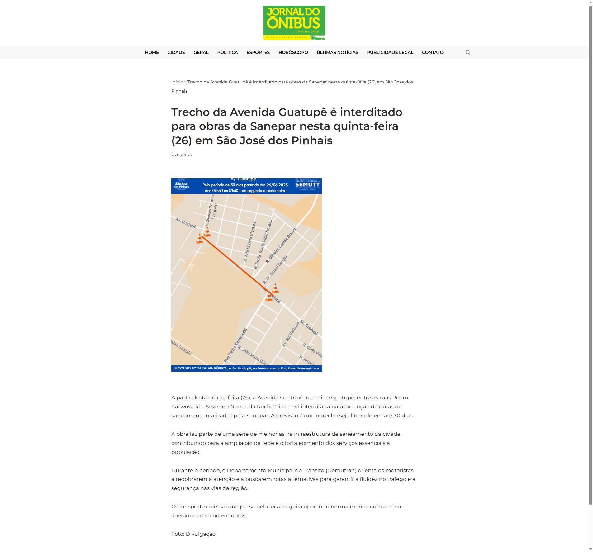 A partir desta quinta-feira (26), a Avenida Guatupê, no bairro Guatupê, entre as ruas Pedro Karwowski e Severino Nunes da Rocha Rios, será interditada para execução de obras de saneamento realizadas pela