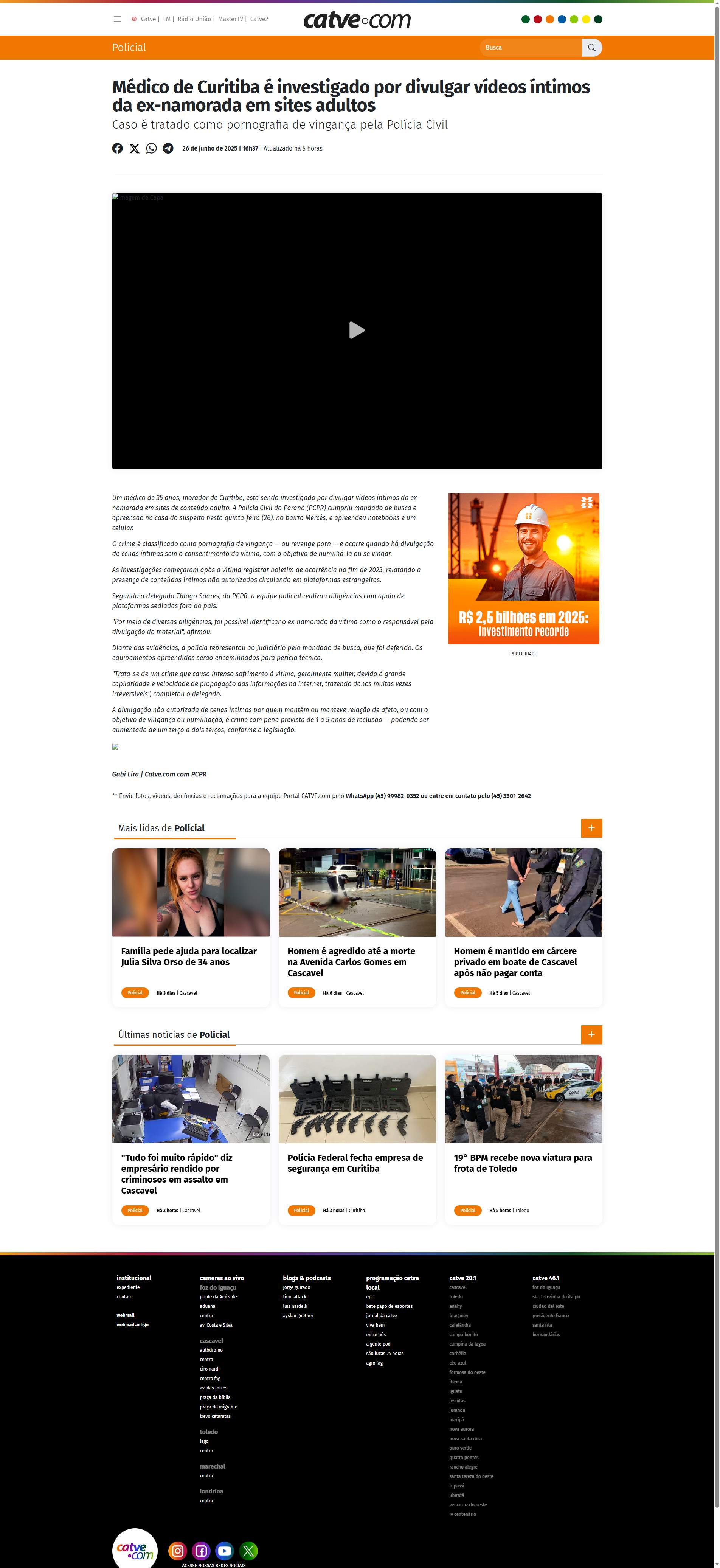 Um médico de 35 anos, morador de Curitiba, está sendo investigado por divulgar vídeos íntimos da ex-namorada em sites de conteúdo adulto. A