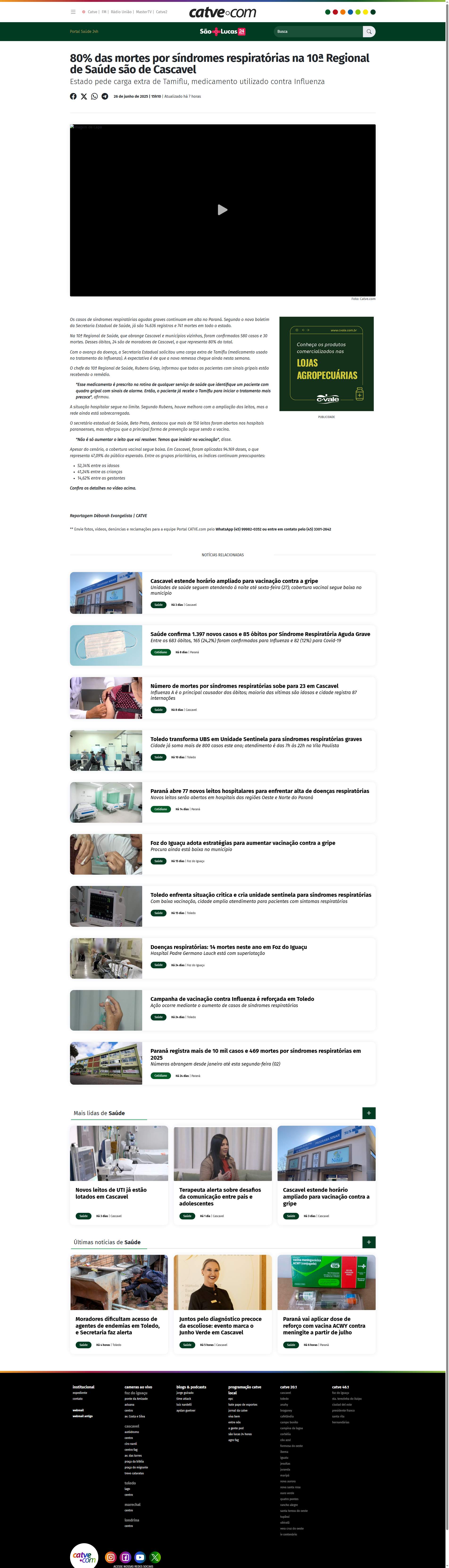 Saúde, que abrange Cascavel e municípios vizinhos, foram confirmados 580 casos e 30 mortes. Desses óbitos, 24 são de moradores de Cascavel, o que representa 80% do total.