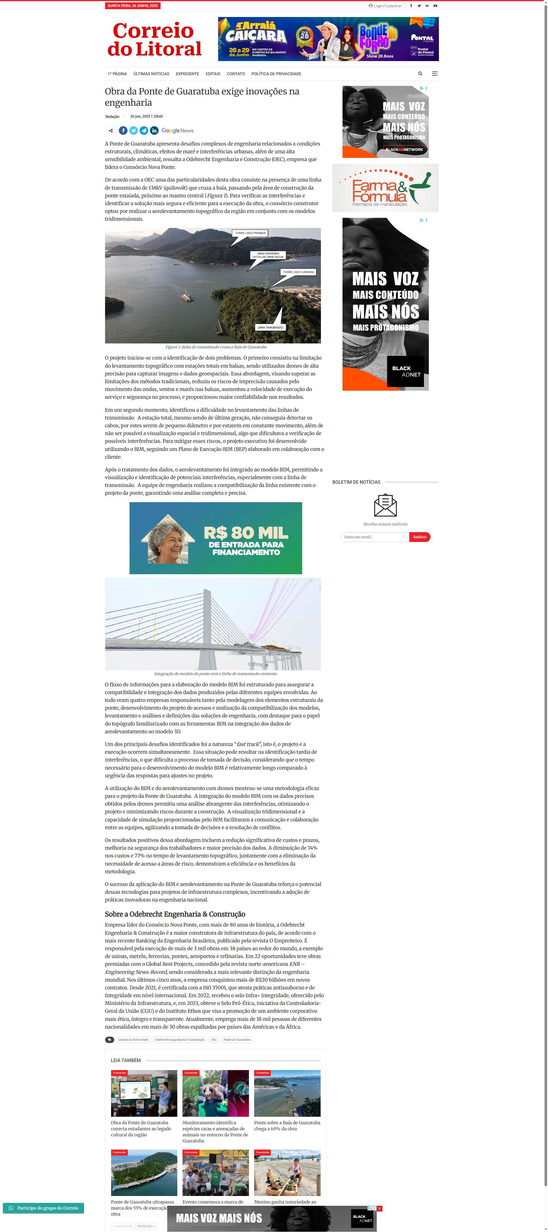Ponte de Guaratuba apresenta desafios complexos de engenharia relacionados a condições estruturais, climáticas, efeitos de maré e interferências urbanas, além de uma alta sensibilidade ambiental, ressalta a Odebrecht Engenharia e Construção (OEC), empresa que lidera o Consórcio Nova Ponte.