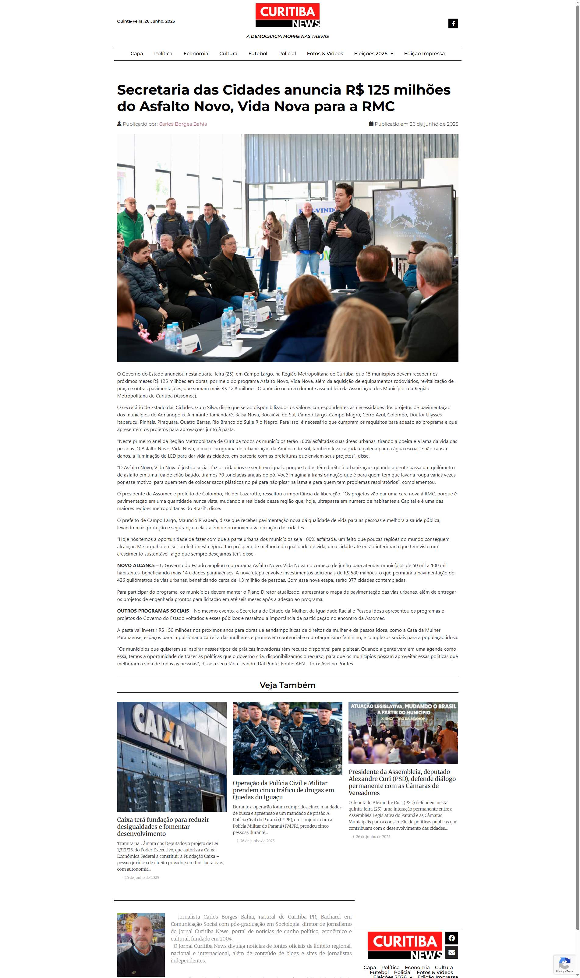 NOVO ALCANCE – O Governo do Estado ampliou o programa Asfalto Novo, Vida Nova no começo de junho para atender municípios de 50 mil a 100 mil habitantes, beneficiando mais 14 cidades paranaenses. A nova etapa envolve investimentos adicionais de R$ 580 milhões, o que permitirá a pavimentação de 426 quilômetros de vias urbanas, beneficiando cerca de 1,3 milhão de pessoas. Com essa nova etapa, serão 377 cidades contempladas.