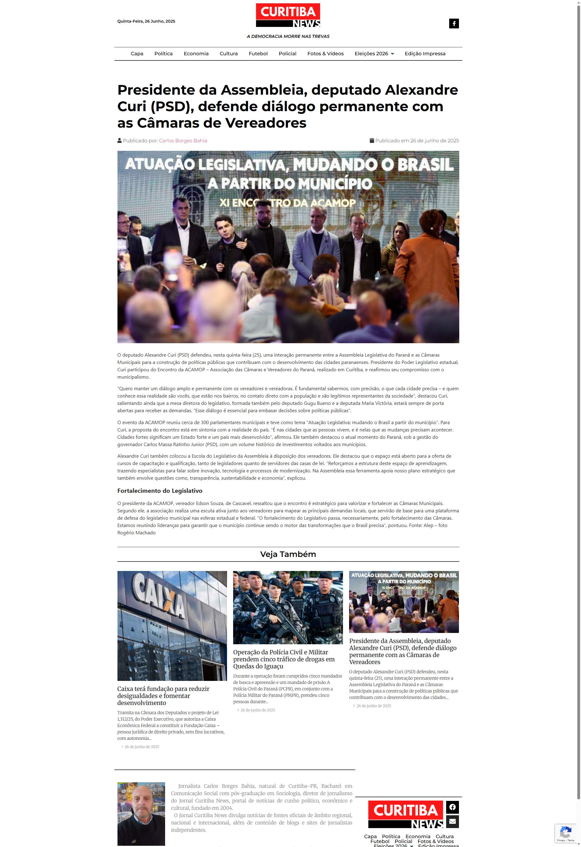 O evento da ACAMOP reuniu cerca de 300 parlamentares municipais e teve como tema “Atuação Legislativa: mudando o Brasil a partir do município”. Para Curi, a proposta do encontro está em sintonia com a realidade do país. “É nas cidades que as pessoas vivem, e é nelas que as mudanças precisam acontecer. Cidades fortes significam um