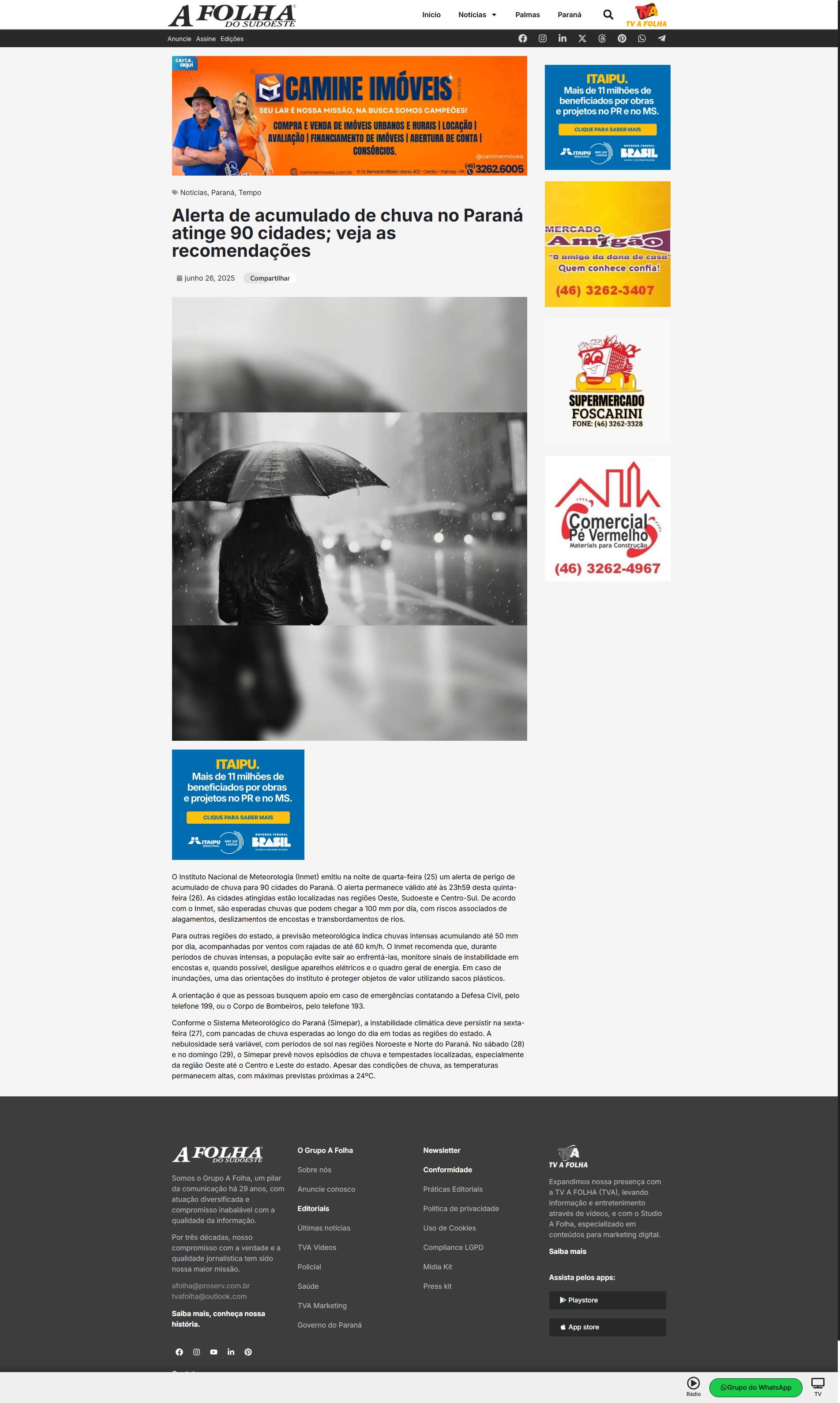 Paraná. O alerta permanece válido até às 23h59 desta quinta-feira (26). As cidades atingidas estão localizadas nas regiões Oeste, Sudoeste e Centro-Sul. De acordo com o Inmet, são esperadas chuvas que podem chegar a 100 mm por dia, com riscos associados de alagamentos, deslizamentos de encostas e transbordamentos de rios.