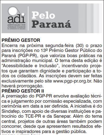 Encerra na próxima segunda-feira (30) o prazo para inscrições no 13º Prêmio Gestor Público do Paraná (PGP-PR), que valoriza boas práticas na administração municipal. O tema desta edição é “Acessibilidade e Inclusão”, incentivando projetos que garantam dignidade e participação a todos os cidadãos. As inscrições devem ser feitas exclusivamente pelo site www.pgp-pr.org.br. Não haverá prorrogação.