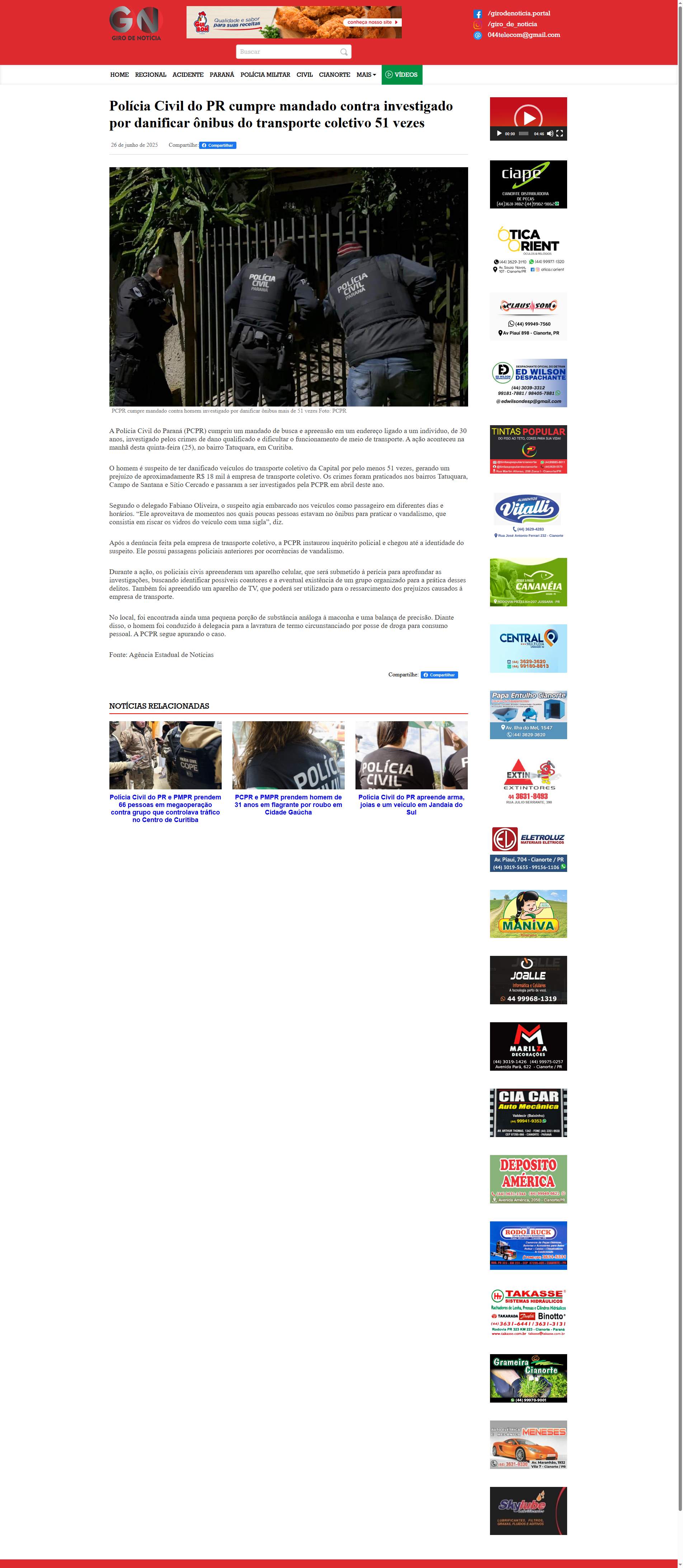 Polícia Civil do Paraná (PCPR) cumpriu um mandado de busca e apreensão em um endereço ligado a um indivíduo, de 30 anos, investigado pelos crimes de dano qualificado e dificultar o funcionamento de meio de transporte. A ação aconteceu na manhã desta quinta-feira (25), no bairro Tatuquara, em Curitiba.