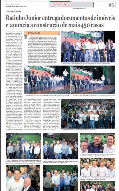 Umuarama - O maior programa habitacional da história está sendo colocado em prática no Paraná. O destaque foi dado pelo governador Carlos Massa Ratinho Junior durante evento realizado na tarde desta quinta-feira (5) em Umuarama, onde 275 famílias receberam as matrículas de seus imóveis, dentro do projeto “Morar Legal”, que investiu R$ 201 mil na regularização de imóveis nos bairros Parque Industrial, Mutirão do Alvorada e Jardim Alto da Glória. O evento reuniu prefeitos, autoridades e moradores dos bairros beneficiados no teatro do Centro Cultural Vera Schubert. Emocionado, Hermes Pimentel lembrou que conhecia a história de luta das famílias do Parque Industrial [onde o prefeito reside]. “Tenham certeza de que hoje para mim é um dia inesquecível e a alegria de vocês é minha alegria. E os cidadãos de Umuarama podem saber que este é só o começo de nosso projeto para acabar com o déficit habitacional na cidade, pois novidades estão chegando”, garantiu. O prefeito refere-se à construção de ao menos 450 casas para famílias que mais necessitam, obras que serão realizadas por meio de convênio com o Governo do Estado e Cohapar (Companhia de Habitação do Paraná), como anunciou Ratinho Junior em seu discurso.